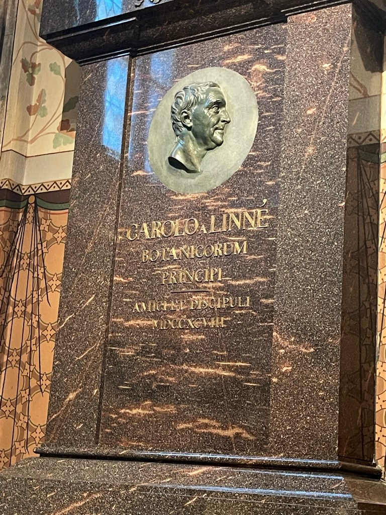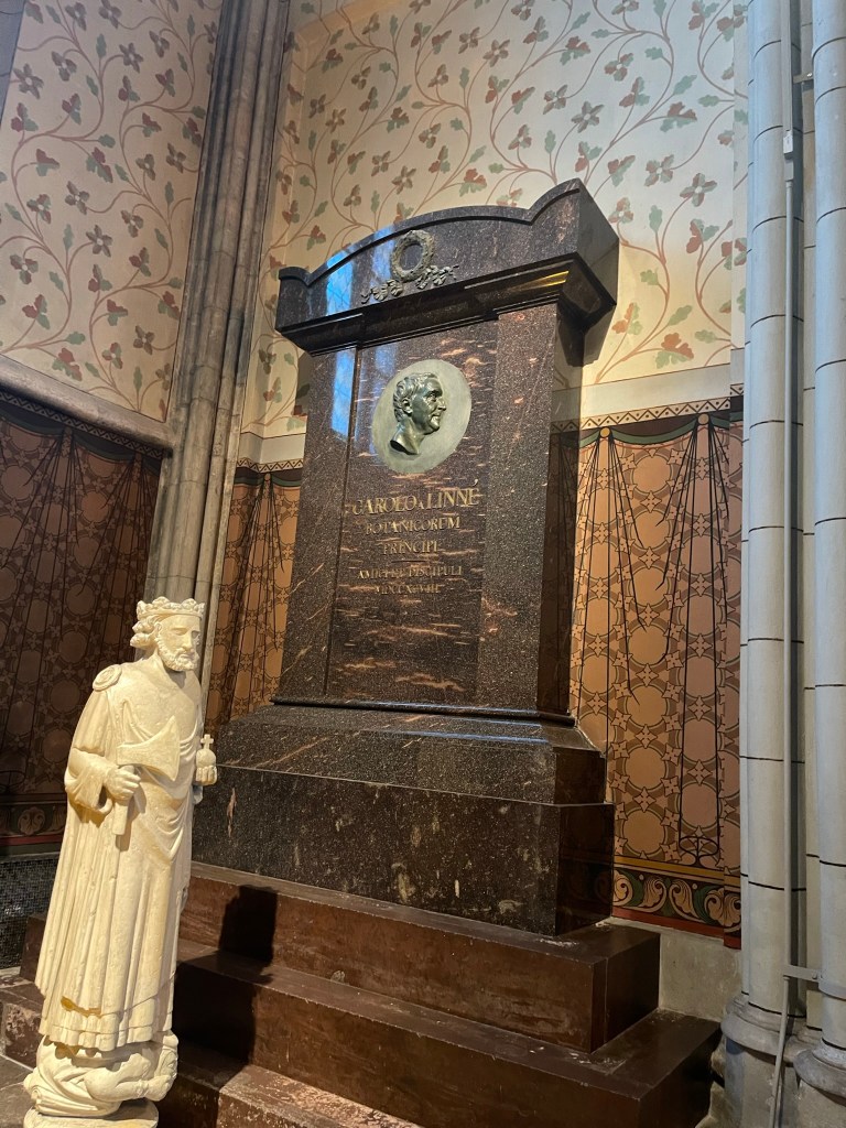 Inskriptionen lyder: Botanicorum principi – Botanikens furste // The inscription translates: the Prince of BotanyFamiljen Linnés gravplats ligger i golvet utanför Minneskoret. Där begravdes förutom Carl von Linné och hans hustru Sara Lisa Moraea även sönerna Johan och Carl, dottern Lisa Stina och en dotterson. Den enkla gravstenen berättar, i svensk översättning: ”Benen efter Carl von Linné, guldprydd riddare. Åt den bäste av makar och den ende sonen, Carl von Linné, faderns efterträdare, och åt sig själv av Sara Elisabet Moraea”. // The Linnaeus family’s grave is located on the floor outside the Memorial Choir. In addition to Carl von Linné and his wife Sara Lisa Moraea, their sons Johan and Carl, daughter Lisa Stina and a grandson were also buried there. The simple tombstone tells, in Swedish translation: ‘The bones after Carl von Linné, gold-adorned knight. To the best of spouses and the only son, Carl von Linné, the father’s successor, and to himself by Sara Elisabet Moraea’.