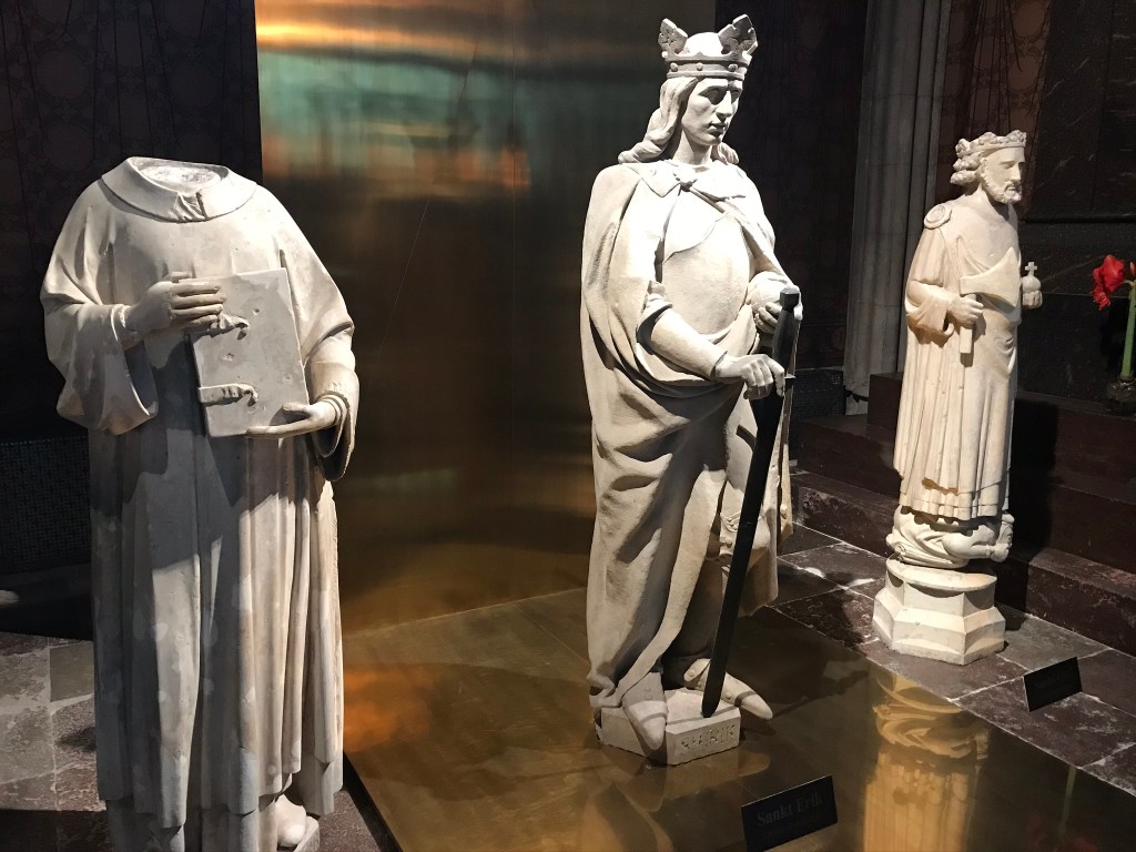 Sandstensstatyn föreställande kung Erik Jedvardsson, Sveriges nationalhelgon (i mitten), gjordes i slutet av 1800-talet av skulptören Teodor Lundberg (1852-1926). Den medeltida Eriksskulpturen var först placerad i södra portalen men flyttades till västra portalen när den blev klar. Eriksbilden togs bort under 1500-talet. // The sandstone statue depicting King Erik Jedvardsson, Sweden’s national saint (in the middle), was made in the late 19th century by the sculptor Teodor Lundberg (1852-1926). The medieval Erik sculpture was first placed in the south portal but was moved to the west portal when it was completed. The statue was removed during the 16th century. Norra portalens staty av kalksten föreställer kung Olav Haraldsson (995-1030), Norges nationalhelgon. Skulpturen är troligen ett svenskt arbete från tidigt 1300-tal. Statyn har haft en yxa i sin hand som kan ha tagits ner från den för att strykas mot pilgrimernas sjuka kroppsdelar. Trollet under hans fötter kallas underliggare och kanske symboliserar helgonets hedniska förflutna eller ondskans makt som han bekämpade som kristen. // The northern portal’s statue of limestone depicts King Olav Haraldsson (995-1030), Norway’s national saint. The sculpture is probably a Swedish work from the early 14th century. The statue has had an ax in its hand that may have been taken down from it to be stroked against the pilgrims’ diseased body parts. The troll under his feet is called the subordinate and perhaps symbolizes the saint’s pagan past or the power of evil that he fought as a Christian. Diakonen Lars håller i en bok. Sankt Lars led martyrdöden i Rom år 258. Skulpturen av kalksten är troligen gjord omkring 1300 av den franske mästaren Estiennes byggnadshytta i Uppsala. Det ursprungliga huvudet är inte bevarat och ett nyare från 1890-talet stals 1998. Från början stod statyn i norra portalen, men flyttades till den södra på 1430-talet. // Deacon Lars holds a book. Saint Lars suffered martyrdom in Rome in 258. The sculpture of limestone was probably made around 1300 by the French master Estienne’s building cabin in Uppsala. The original head is not preserved and a newer one from the 1890s was stolen in 1998. Initially, the statue stood in the north portal, but was moved to the south in the 1430s.