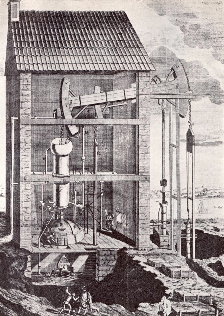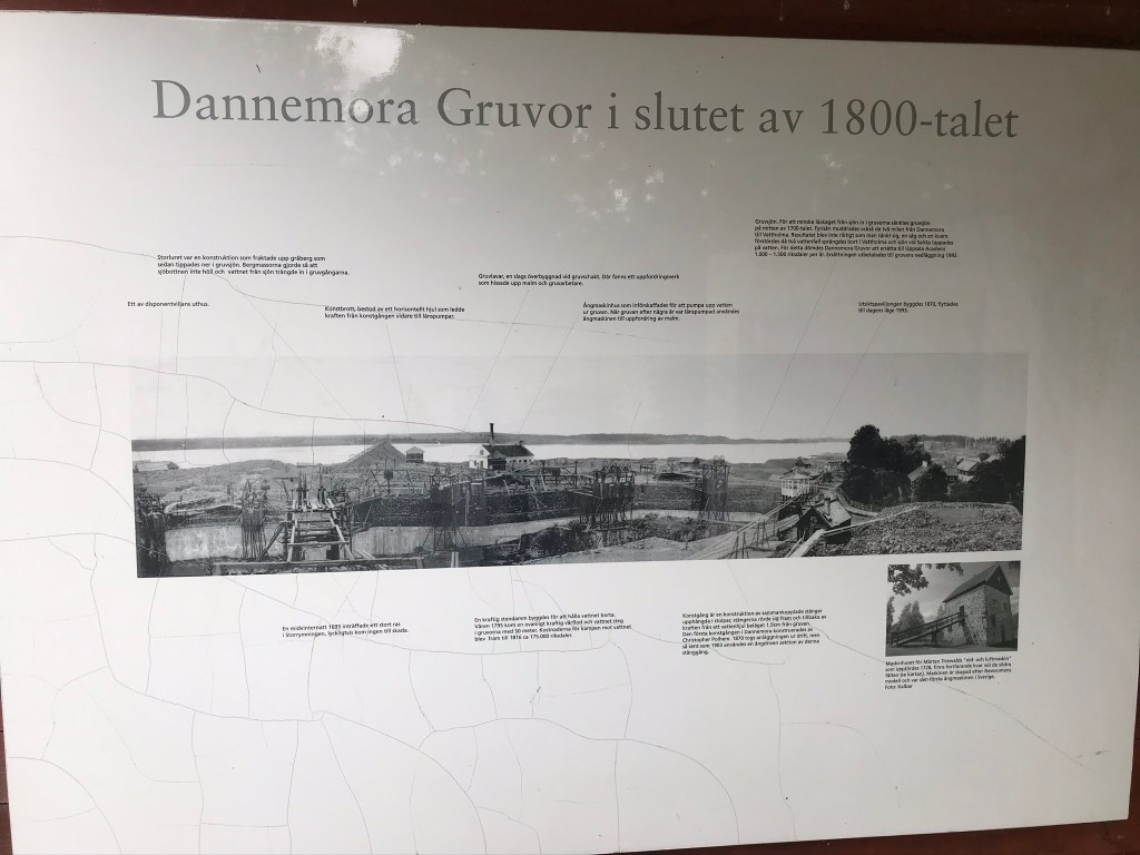 Triewalds eld- och luftmaskin vid Dannemora gruvor, 1720-talet. Bildkälla: Wikipedia // Triewalds’ fire and air machine at Dannemora mines, 1720s. Image source: WikipediaDen första handelsboden inrättades 1869 genom ombyggnad av ett äldre hus. Tidigare fick man ut säd, sill, salt och andra förnödenheter från bl.a. ett magasin och saltbod som står kvar invid nya disponentbostaden. Dessa byggnader samt intilliggande kassörskontor från 1700-talet är nu i privat ägo. Framför gruvhandeln stod ett våghus där malmen vägdes innan malmfororna gick ut till de olika bruken. Torget kallades för Malmtorget. Gruvhandeln om- och påbyggdes i början av 1900-talet och affären upphörde sista juni 1974. Den är nu i privat ägo. // The first trading post was established in 1869 by rebuilding an older house. Previously, grain, herring, salt and other necessities were obtained from e.g. a magazine and salt shed that remains next to the new manager’s residence. These buildings and adjacent cashier’s offices from the 18th century are now privately owned. In front of the mining trade was a weighing house where the ore was weighed before the ore furnaces went out to the various ironworks. The square was called Malmtorget. The mining shop was rebuilt and extended at the beginning of the 20th century and the business ceased last June 1974. It is now privately owned.I den gamla gruvfogdebostaden ”Elfkarleby gård” från slutet av 1600-talet inrättades 1869 ett apotek. Tidigare hade gruvfogdarna och gruvläkarna tillhandahållit medicin. 1908 byggdes ett nytt apotek i jugendstil som tjänstgjorde fram till 1971 då apoteksrörelsen flyttades till Österbybruk. Gamla apoteket var bostadshus fram till 1977 då det på grund av rasrisk måste utrymmas. // In 1869, a pharmacy was established in the old mining bailiff’s residence ”Elfkarleby gård” from the end of the 17th century. Previously, the bailiffs and the mining doctors had provided medicine. In 1908, a new Art Nouveau pharmacy was built, which served until 1971 when the pharmacy movement was moved to Österbybruk. The old pharmacy was a residential building until 1977 when it had to be evacuated due to the risk of a landslide.Doktorsbostället var läkarmottagning och bostad för gruvfältskär eller gruvkirurg som läkaren också kallades. Huset är från 1674 och därmed det äldsta på gruvbacken. Under en längre tid på 1900-talet var läkarmottagningen inrymd i sjukstugan till vänster på gården. 1980 upphörde provinsialläkartjänsten vid Dannemora. Byggnaden är nu i privat ägo. // The doctor’s residence was a doctor’s surgery and a residence for a mining field cutter or mining surgeon as the doctor was also called. The house is from 1674 and thus the oldest on the mining hill. For a long time in the 20th century, the doctor’s office was housed in the infirmary on the left of the farm. In 1980, the provincial medical service at Dannemora ceased. The building is now privately owned.Gruvan är enligt en uppgift från 1676 den äldsta i Dannemora och troligen från tiden före 1481. Storrymningen är gemensamt namn för de ursprungliga gruvorna Dammsrymningen, Pumpgruvan, Djupgruvan och Stora Rymningen (Kompanigruvorna) samt Hjulvindsgruvan, Jordgruvan och Ödesgruvorna. Dagbrottet, som är Europas största gjort utan maskinell kraft, har uppstått genom att banden mellan de olika gruvorna rasat samman! Längd 270 m, bredd 60 m, ursprungligt djup 140 m. Genom ras i norra delen har gruvan förbindelse ned till ca. 480 m. djup. Storrymningen, ”Mellanfältsmalmen”, har överst brutits genom tillmakning i dagbrott och längre ner genom igensättningsbrytning, magasinsbrytning, skivpallsbrytning och längst ner i gruvan skivrasbrytning. // According to information from 1676, the mine is the oldest in Dannemora and probably from the time before 1481. Storrymningen is the common name for the original mines Dammsrymningen, Pumpgruvan, Djupgruvan and Stora Rymningen (Kompanigruvorna) and Hjulvindsgruvan, Jordgruvan and Ödesgruvorna. The open pit, which is Europe’s largest made without mechanical power, has arisen as the ties between the various mines collapsed! Length 270 m, width 60 m, original depth 140 m. Through landslides in the northern part, the mine has a connection down to approx. 480 m. depth. The large-scale escape, the ” Intermediate Field Ore ”, has been mined at the top by quarrying in open pits and further down by clogging, magazine breaking, pallet breaking and at the bottom of the mine disc slashing.Gruvkammare var en föregångare till senare tiders gruvstugor. Gruvkammare fanns på flera ställen å gruvfältet och användes för arbetarnas torkning av arbetskläder och som värmestuga. Denna är från början av 1800-talet. Under 1900-talet användes byggnaden som målarverkstad. // Mining chambers were a precursor to recent mining cottages. Mining chambers were located in several places on the mining field and were used for the workers’ drying of work clothes and as a heating cabin. This is from the beginning of the 19th century. During the 20th century, the building was used as a painting workshop.Örners schakt upptogs 1743 till 300 meters djup. Nuvarande djup är 350 m. Örners schakt har ortförbindelse till Norra fältet och Konstängsfältet på flera nivåer, samt till Södra fältet på 340 m nivå. 1819 byggdes en gruvlave i trä. Den ombyggdes 1914 och förstördes av eld den 15 juni 1960. // Örner’s shaft was excavated in 1743 to a depth of 300 meters. The current depth is 350 m. Örner’s shaft has local connections to the Norra field and the Konstäng field on several levels, as well as to the Södra field at the 340 m level. In 1819, a wooden mining headframe was built. It was rebuilt in 1914 and destroyed by fire on June 15th, 1960.Klockstapeln är enligt årtal på vindflöjeln uppförd 1754. 1823 byggdes klockstapeln om och fick sitt nuvarande utseende. Det gamla 