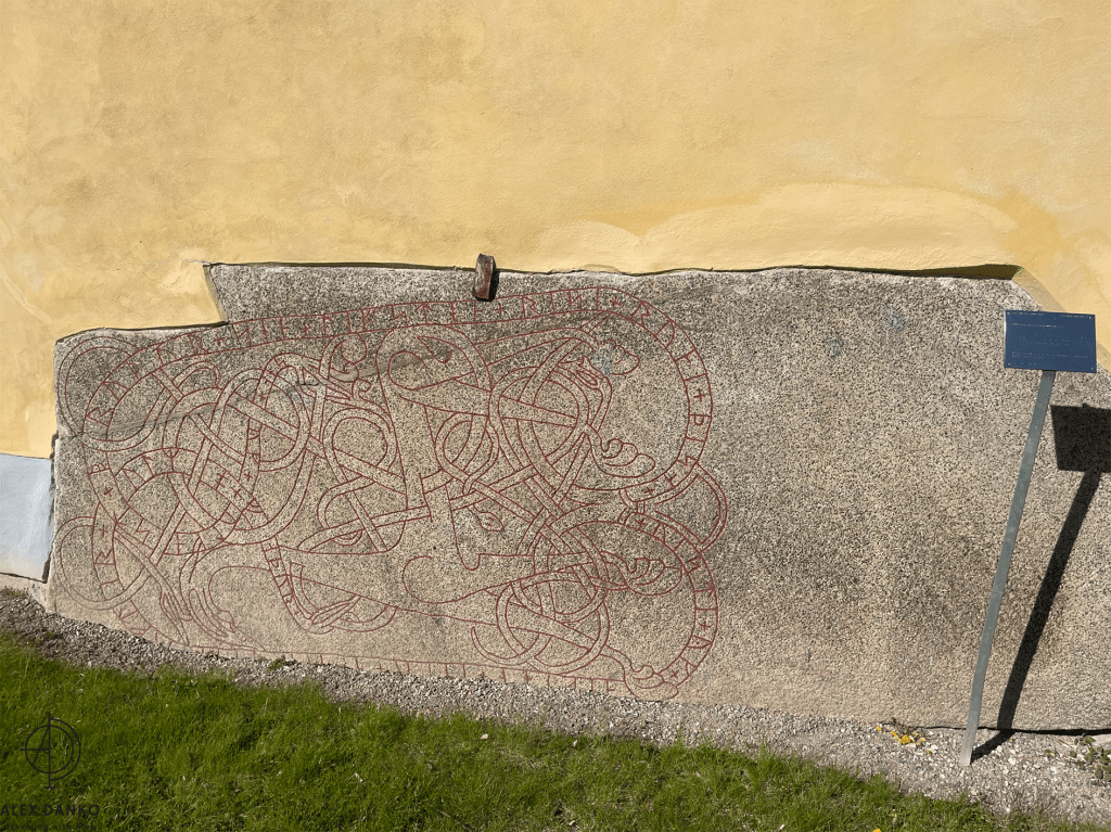 I södra väggen finns runinskrift Vs29 inmurad. Inskriften från 1000-talet lyder: ”Visäte och Halvdan läto hugga stenen efter Holme, sin fader, och efter Holmfast, sin broder. Livsten ristade dessa runor”. Runmästaren Livsten var verksam vid mitten av 1000-talet, huvudsakligen i Enköpingstrakten (Riksantikvarieämbetet).