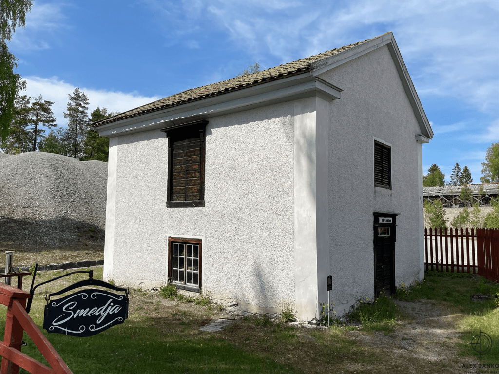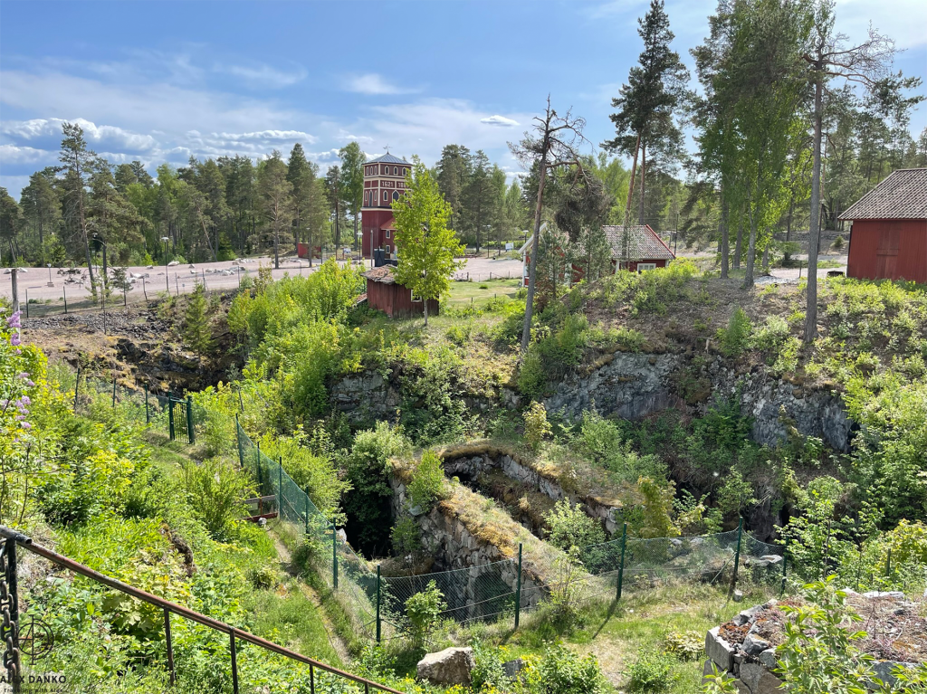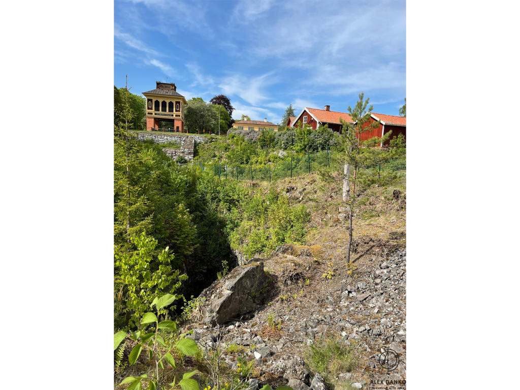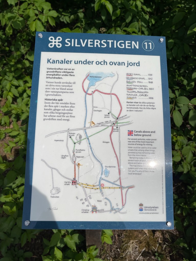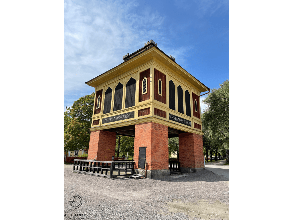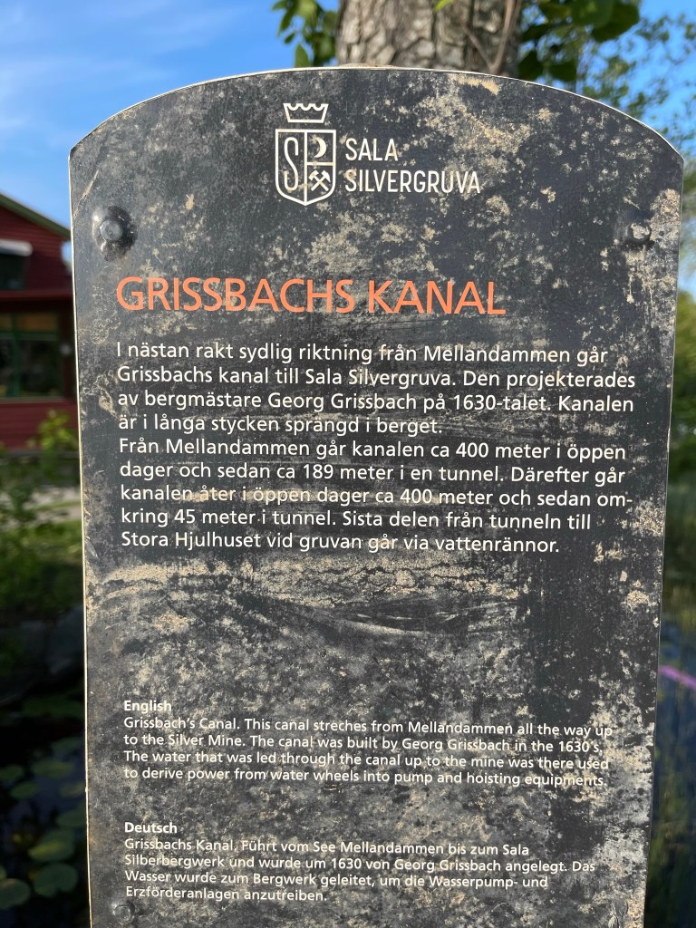 Från slutet av 1500-talet och fram till 1890-talet var vattenkraft den viktigaste energikällan vid gruvan. Från stora vattenhjul leddes kraften direkt eller med stånggångar till spel och pumpar. När detta turbintorn byggdes vid 1870-talets slut introducerades en ny teknik. Vattnet drev en stålturbin som hade högt varvtal. Kraften kunde efter nedväxling ledas vidare med rentransmissimer eller linspel och användas i verkstäder och produktionsbyggnader. Kring sekelskiftet 1900 kopplades en elektrisk generator till turbinen. Därigenom fick man elektrisk belysning och kraft till mindre områden. Gruvkontorshuset byggdes år 1823-1832. Konststigaren var den första som bodde här. Konststigaren var förman för konststaten som ansvarade för reparationer och byggnadsarbeten vid gruvan. Omkring 1920 flyttade gruvkontoret in i detta hus. Från 1644 till 1883 var detta gruvans viktigaste byggnad. Hit leddes vattnet från det stora sjösystemet och här drev det två bröstfallshjul av trä med ca 12 m i diameter. Kraften överfördes via stånggångar till pumpar och uppfordringsverk vid Knektschaktet, 140 m och Makalösschaktet, 90 m härifrån. Under vissa perioder fanns stånggångar även till Carl XI:s schakt samt till Nygruvan, ca 400 respektive 600 m långa. Det första hjulhuset på platsen byggdes 1644. Det byggdes om fullständigt flera gånger under 1700-talet och fick sin nuvarande form omkring 1890. Då hade man rivit vattenhjulen med tillhörande rännor. I juni 1994 skadades tyvärr byggnaden svårt av en brand. Klensmedjan byggdes i korsvirkesteknik och tegel år 1807. Smedjan hade ursprungligen två härdar och här tillverkades bl a handredskap som malmrakor, brytspett, bergkilar, borrstål m m. På andra våningen fanns smedjans järnlager där man förvarade råmärken i olika dimensioner till smidet. Tidigare fanns en träbro upp till porten på andra våningen. Från 1920- till 1950-talet användes smedjan som tvättstuga för dem som bodde på gruvområdet. Andra våningen fungerade då som torkvind. Kuskbostadens äldsta del är byggd år 1800 med en tillbyggnad från omkring 1900 och inrymmer idag två rum och kök. Fasaden har tidigare varit spritputsad. Huset har genom åren använts till spruthus, kontor och bostad. Här bodde gruvans sista kusk som hette Ernst Johansson. Drängstugan uppfördes 1850 som brygghus, bod och vedlider i stället för de byggnader som brann ned natten till den tredje maj samma år. Till bygget användes både gammalt och nytt virke. Brygghuset nyttjades av gruvstigarens hushåll för tvätt, bak och öltillverkning. Huset är ombyggt till bostadshus. Drottning Christinas schakts spelhussänkning visar grundmurar eller numera rivna, vattendrivna bergspel. Trärännan som förde driftsvatten till spelet är sedan länge borta, men returkanalen (som är tillmakad i berget) finns kvar och mynnar under Gamla Hjulhuset. Det första bergspelet började anläggas 1662 och stod färdigt tre år senare. Vattenhjulet var av bröstfallstyp med en diameter om 11,3 m och en bredd av 2,7 m. Ett nytt bergspel togs i bruk 1828. Detta spel hade ett vattenhjul av överfallstyp med en diameter om 5,9 m och en bredd av 1,8 m. Under år 1890 avvecklades spelet helt. Christina schaktets bergspel var ett av silvergruvans viktigaste uppfordringsverk i 225 år. Drottning Christinas schakt började sänkas år 1650 och på tio år nåddes ett djup på 190 m. På denna nivå fanns stora malmtillgångar som bröts under senare hälften av 1600-talet. Schaktet sänktes sedan i olika etapper ner till 257 m och blev i samband med det centralschakt eftersom det kom i kontakt med samtliga nivåer i gruvan. Huvudsakligen användes schaktet för uppfordring av malm och gråberg, men också för transport av gruvved, material, hästar och gruvarbetare. Drivkraften för uppfordringen var två stora vattenhjul som fanns i spelhussänkningen strax söder om schaktet. Idag återstår endast grundmurarna av Spelhuset. Den nuvarande laven (överbyggnaden) byggdes 1858 och har blivit en symbol för Sala Silvergruva. Detta block består av dolomit från Finntorpsbrottet, en kilometer sydväst om platsen. De ringformiga mönstren i blocket är en fossil av blågröna alger. De finns i grunda hav och när de växer uppåt i skikt mot ljuset bygger de upp ringformiga pelare. Det sker med hjälp av fin karbonatsand. Fossilen i detta block har det geologiska namnet stromatoliter, av de grekiska orden stroma=bädd och litos=sten. Åldern har beräknats till mellan 1900 och 2000 miljoner år. Det var dessa organismer som satte igång fotosyntesen, med hjälp av vatten, koldioxid och solljus. Wow 🙂Anfarten är uppförd över ingången till 60 metersnivån i gruvan. Ordet ”anfart” är tyska och betyder begynnelse, dvs där man påbörjar nedstigningen till gruvan. Denna nedstigning tillkom i slutet av 1700-talet och den nuvarande överbyggnaden uppfördes 1869-70. Syftet med byggnaden var att gruv- och skrädningsstigarna (förmännen) fick ett kontor och bättre uppsikt över uppfordringen och malmskrädningen (sorteringen). I mitten av rummet tände arbetarna sina tjärbloss (facklor) och oljelampor för att därefter påbörja nedstigningen till sina arbetsplatser. Numera finns belysning, betongtrappor och stålstegar ner till 60-metersnivån. Skrädhuset byggdes i slutet av 1810-talet. Här inne arbetade 10-20 personer, många var kvinnor och äldre pojkar. Man skrädade (sorterade) malmen och slog sönder malmstycken till hanterlig storlek. Gråberg, varp (ofyndigt berg) kastades åt sidan och tippades i stora högar runt om på gruvområdet. Sedan schaktlaven över Christinaschaktet tillkommit 1858 byggdes en rälsbana därifrån över till Skrädhusets övervåning där malmen kördes in. En del malmsortering gjordes också på planen (Gruvtorget) utanför Skrädhuset. Huset byggdes ut 1994-95. Hästen var förr oumbärlig för gruvdriften. Alla transporter gjordes me