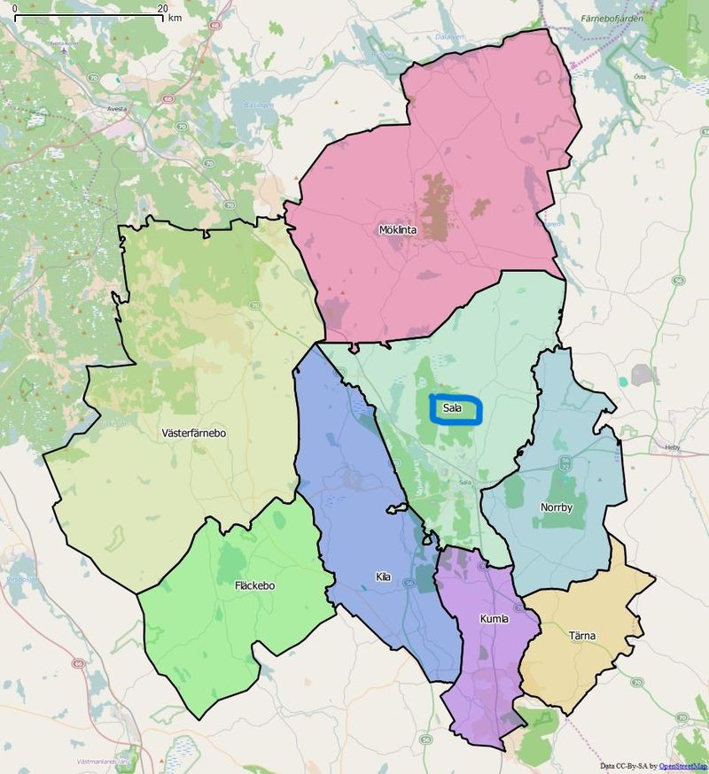 Administrativ tillhörighet: Sala kommun i Västmanlands län (Övertjurbo härad i NO Västmanland); Sala församling i Sala-Norrby-Möklinta pastorat inom Västerås stift