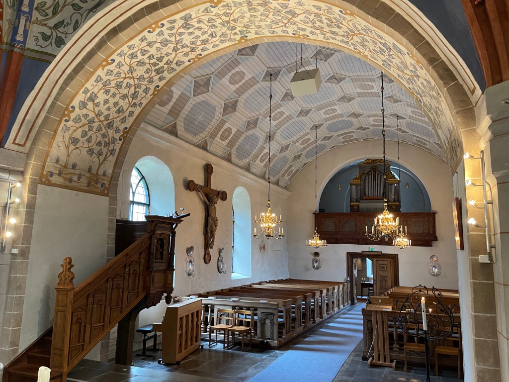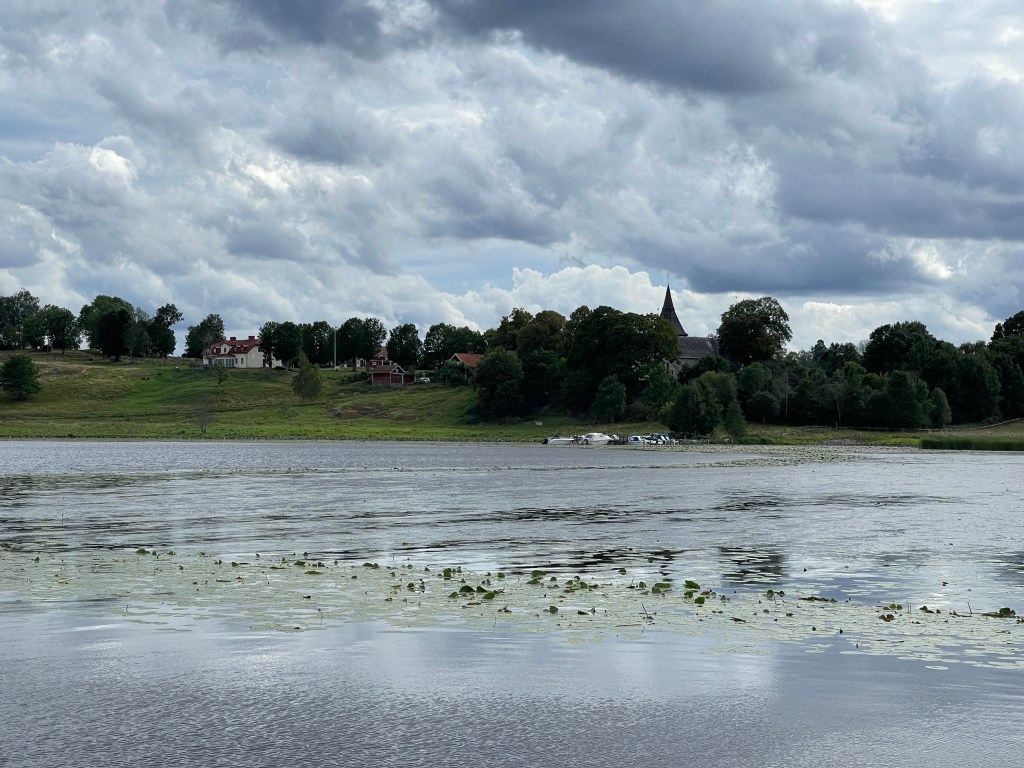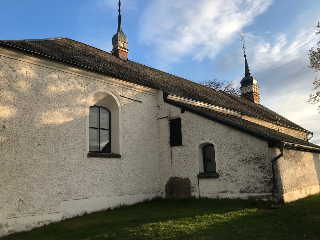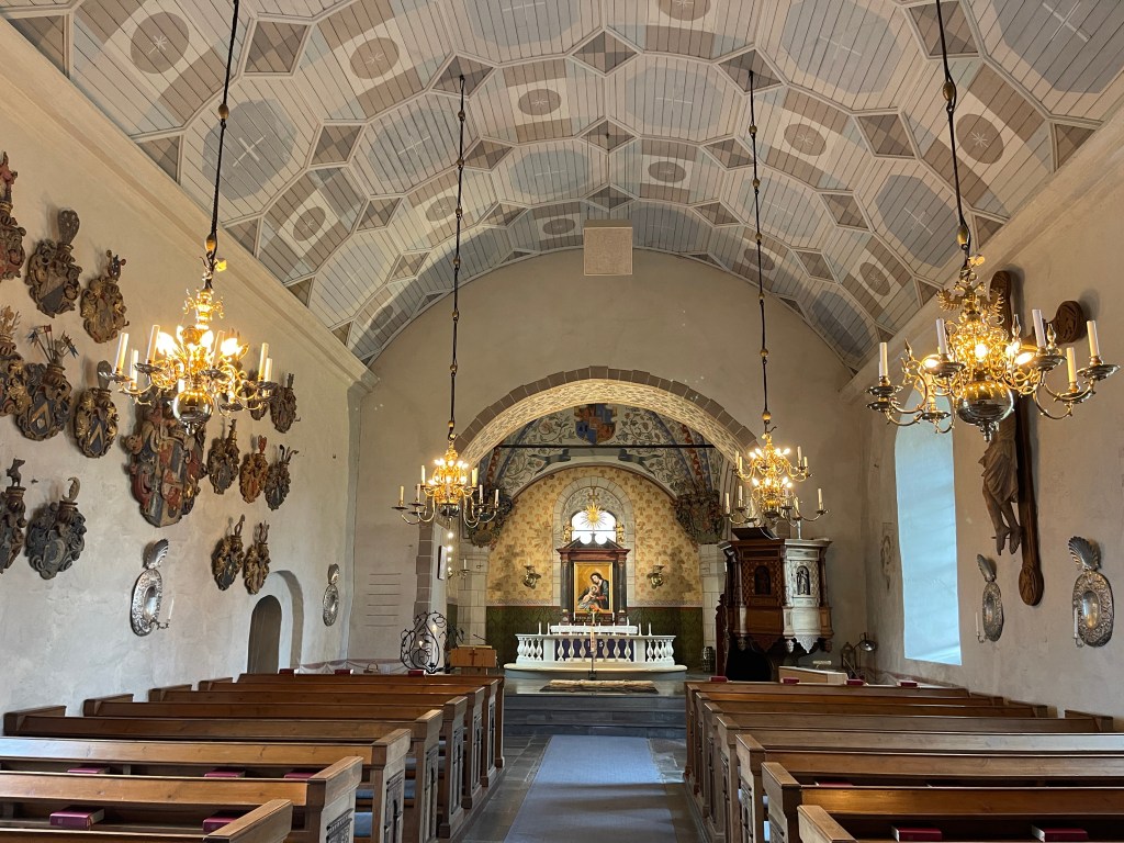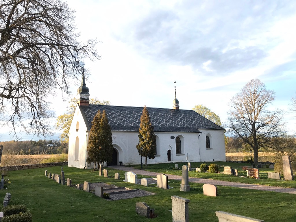 Utsikten från kyrkogården är så vacker. På andra sidan Dalbyviken ligger Vreta udd. Ekoln i bakgrunden.Kyrkan nämns för första gången år 1291 och den första vid namn kända prästen är Andreas, omnämnd 1303. Sakristian härstammar från 1300-talet.På 1480-talet försågs kyrkorummet med målningar utförda antingen av Albertus Pictor eller hans ateljé. Nästan alla målningar är vitrappade. Kyrkorummet imponerar med sitt vackert målade tak och de många adelsvapnen.Otroligt vackra adelsvapen hänger på norra väggen till minne av de många adelsfamiljer som funnit sin sista vila i Dalby kyrka.I koret finns nyare målningar. Mariatavlan skänktes år 1727 av kyrkans patronus, A G Lejonhuvud på Hammarskog, liksom altaruppsatsen från 1719.Krucifixet är tillverkat under 1300-talets första hälft. Korset är en modern rekonstruktion.Uppe på läkaren står Åkerman & Lunds orgel från 1903.Epitafium över Knut Posse på Hammarskog som satt sin prägel på Dalby kyrka.Dopfunten från 1220-talet är kyrkans äldsta klenod.Predikstolen skänktes av Knut Posse i samband med tillbyggnaden av koret år 1659.
