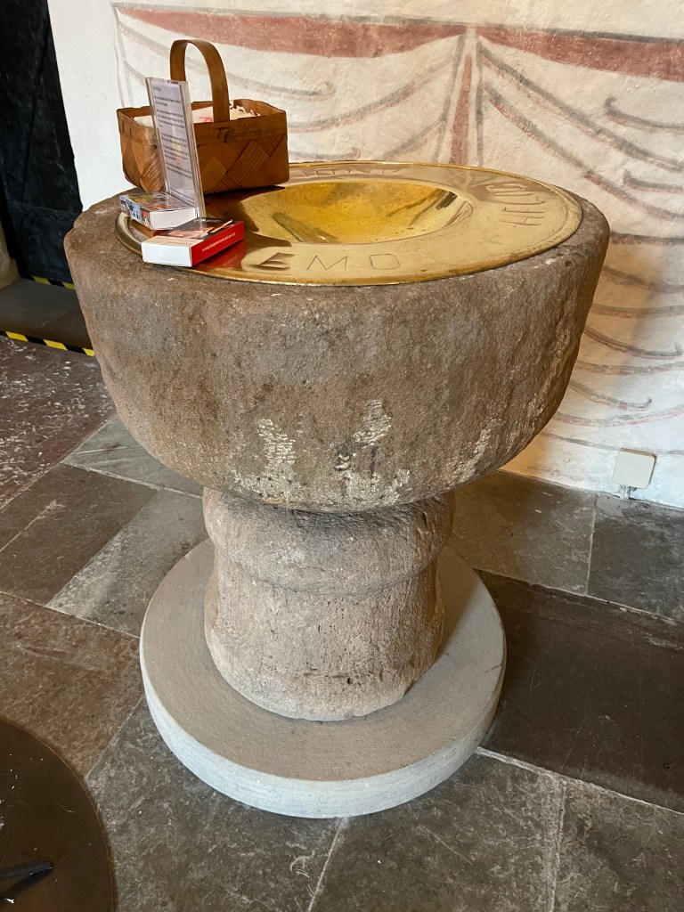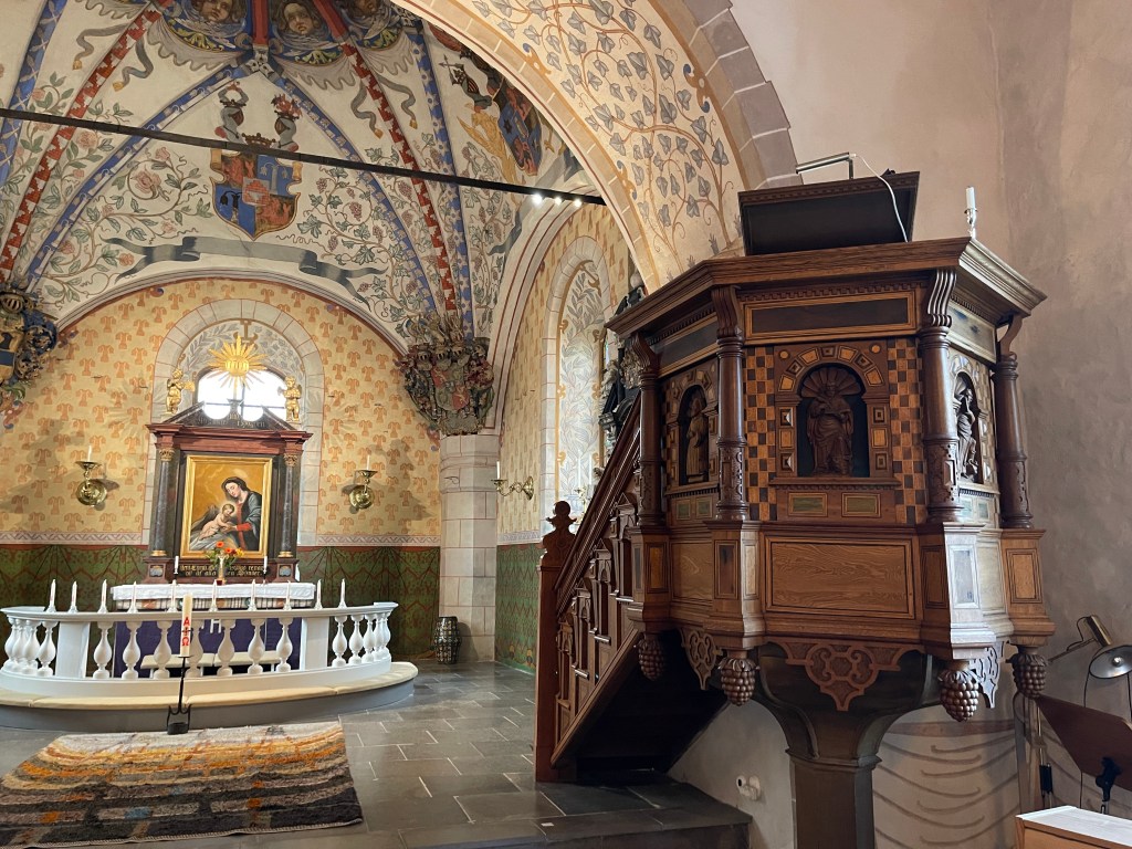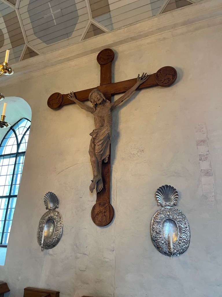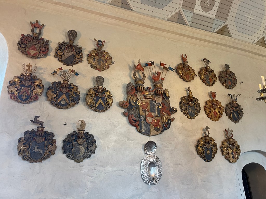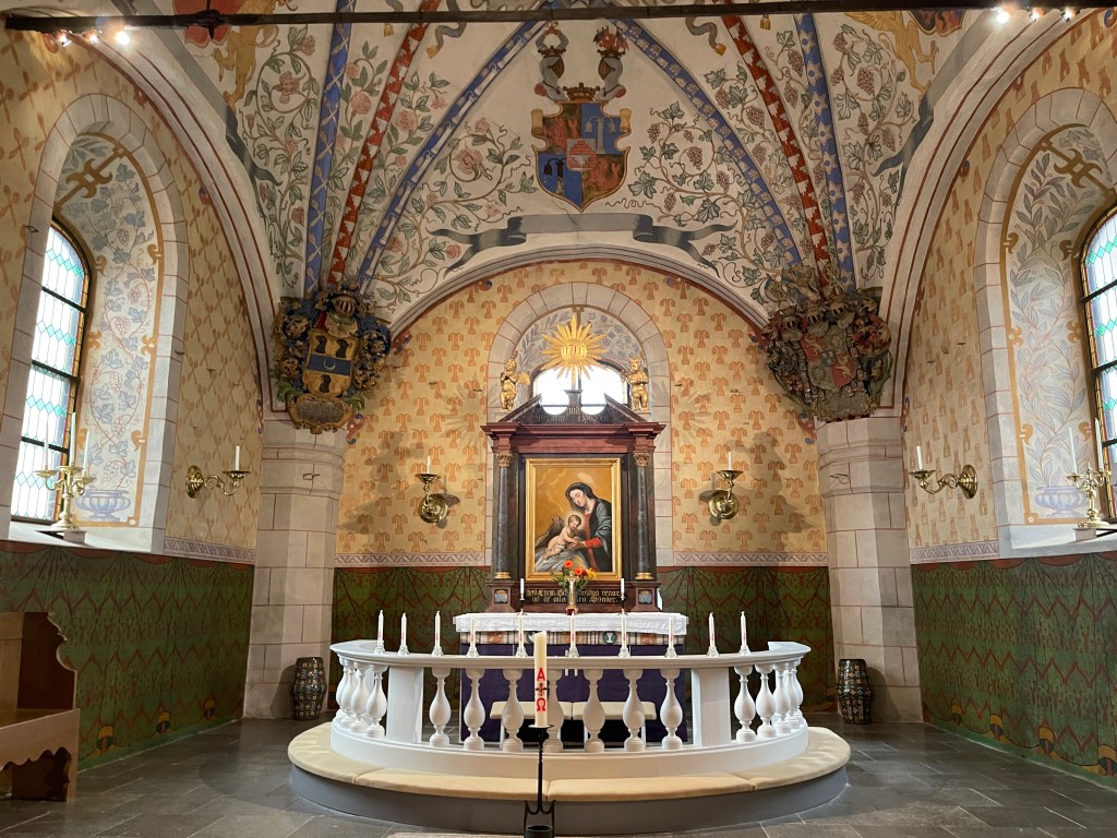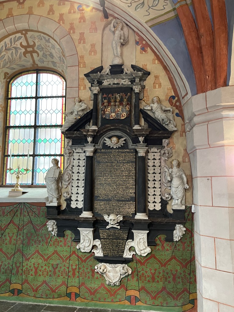 Utsikten från kyrkogården är så vacker. På andra sidan Dalbyviken ligger Vreta udd. Ekoln i bakgrunden.Kyrkan nämns för första gången år 1291 och den första vid namn kända prästen är Andreas, omnämnd 1303. Sakristian härstammar från 1300-talet.På 1480-talet försågs kyrkorummet med målningar utförda antingen av Albertus Pictor eller hans ateljé. Nästan alla målningar är vitrappade. Kyrkorummet imponerar med sitt vackert målade tak och de många adelsvapnen.Otroligt vackra adelsvapen hänger på norra väggen till minne av de många adelsfamiljer som funnit sin sista vila i Dalby kyrka.I koret finns nyare målningar. Mariatavlan skänktes år 1727 av kyrkans patronus, A G Lejonhuvud på Hammarskog, liksom altaruppsatsen från 1719.Krucifixet är tillverkat under 1300-talets första hälft. Korset är en modern rekonstruktion.Uppe på läkaren står Åkerman & Lunds orgel från 1903.Epitafium över Knut Posse på Hammarskog som satt sin prägel på Dalby kyrka.Dopfunten från 1220-talet är kyrkans äldsta klenod.Predikstolen skänktes av Knut Posse i samband med tillbyggnaden av koret år 1659.