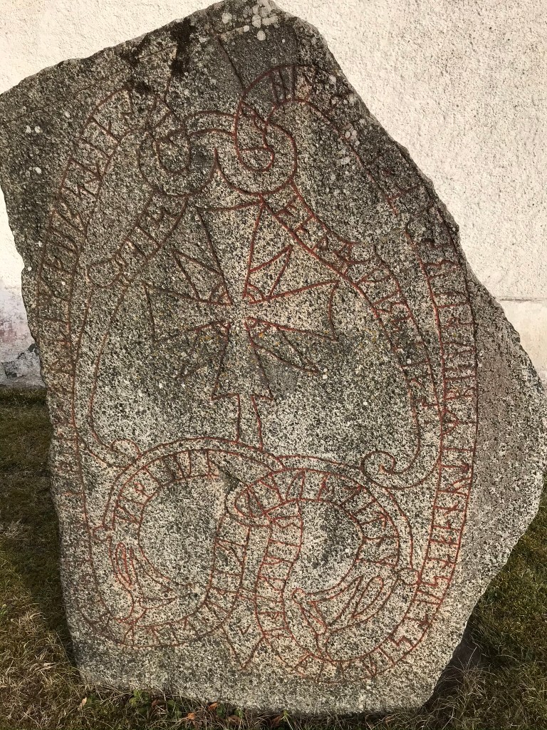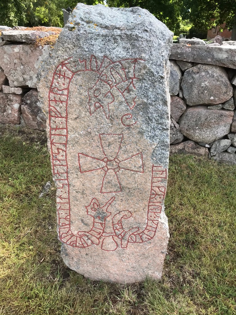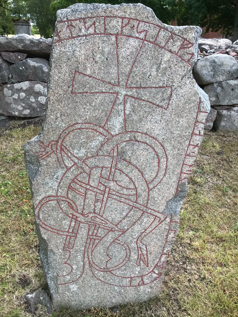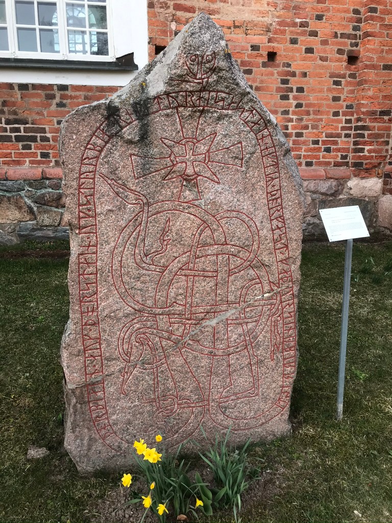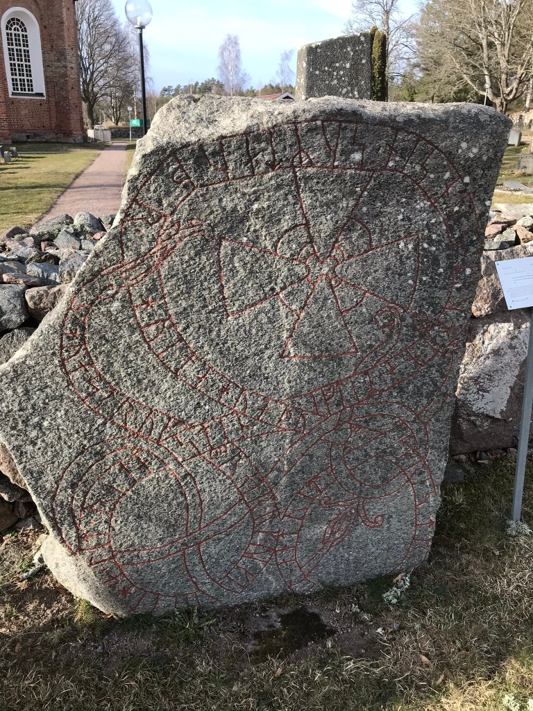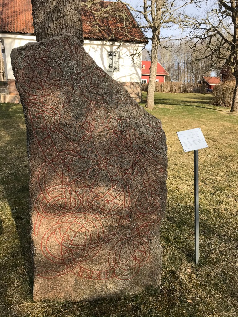 Runstenen är känd från 1600-talet och låg då som tröskelsten till kordörren. Den togs ut 1864 på initiativ av Rickard Dybeck. Man kan lägga märke till att faderns och två av sönernas namn börjar med Tor-. Att föräldrar och barn på detta sätt har en namnled gemensam är inte ovanligt i vikingatidens namnskick. Stenen är signerad av den kände runristaren Öpir och ristningen är mycket karaktäristisk för honom. Runorna i ristarsignaturen är ristade upp och ned, s.k. stuprunor. // The runestone is known from the 17th century and was then used as a threshold stone for the choir door. It was taken out in 1864 on the initiative of Rickard Dybeck. One can notice that the names of the father and two of the sons begin with Tor-. That parents and children in this way have a common name is not unusual in the naming conventions of the Viking Age. The stone is signed by the famous rune carver Öpir and the carving is very characteristic of him. The runes in the carver’s signature are carved up and down, so-called scarp runes.