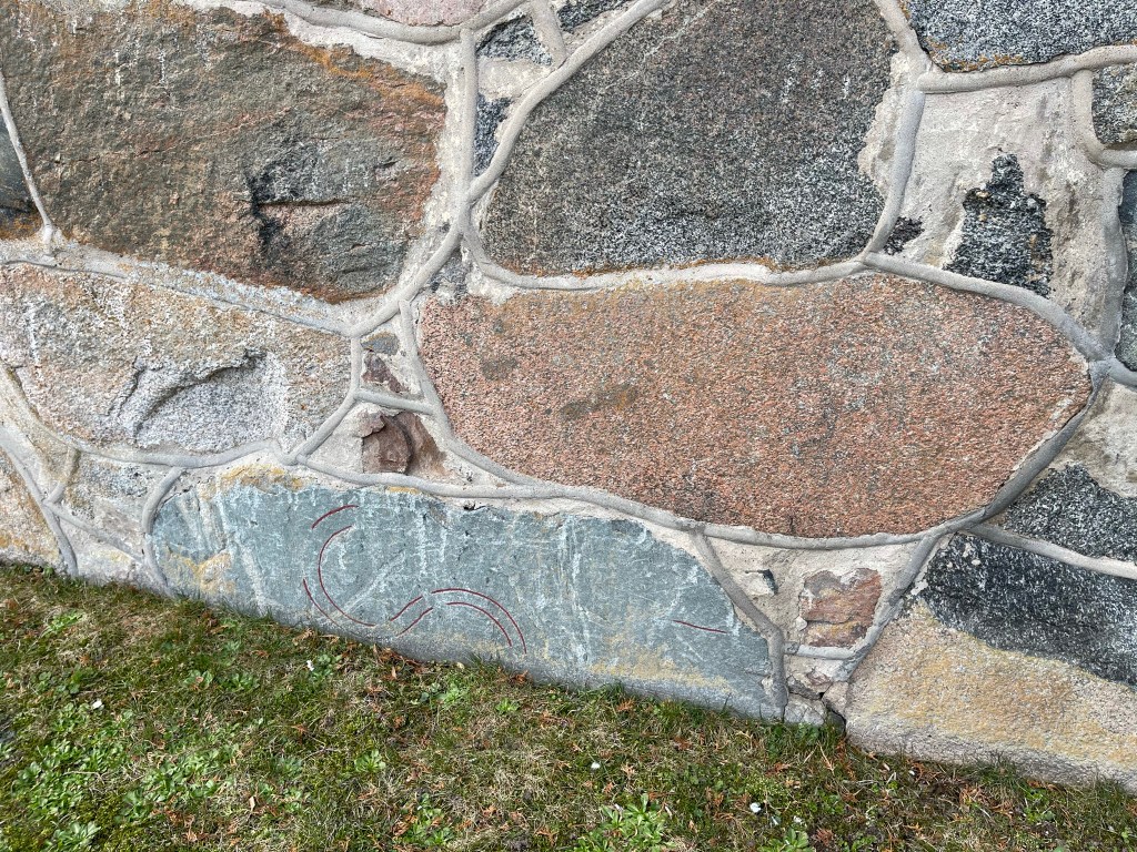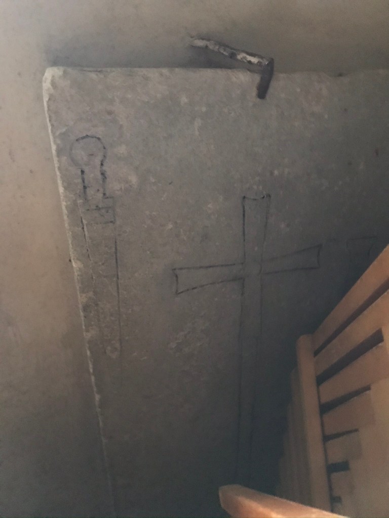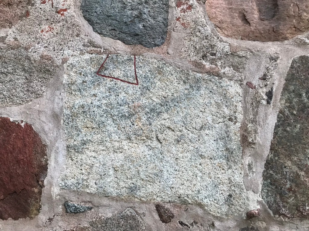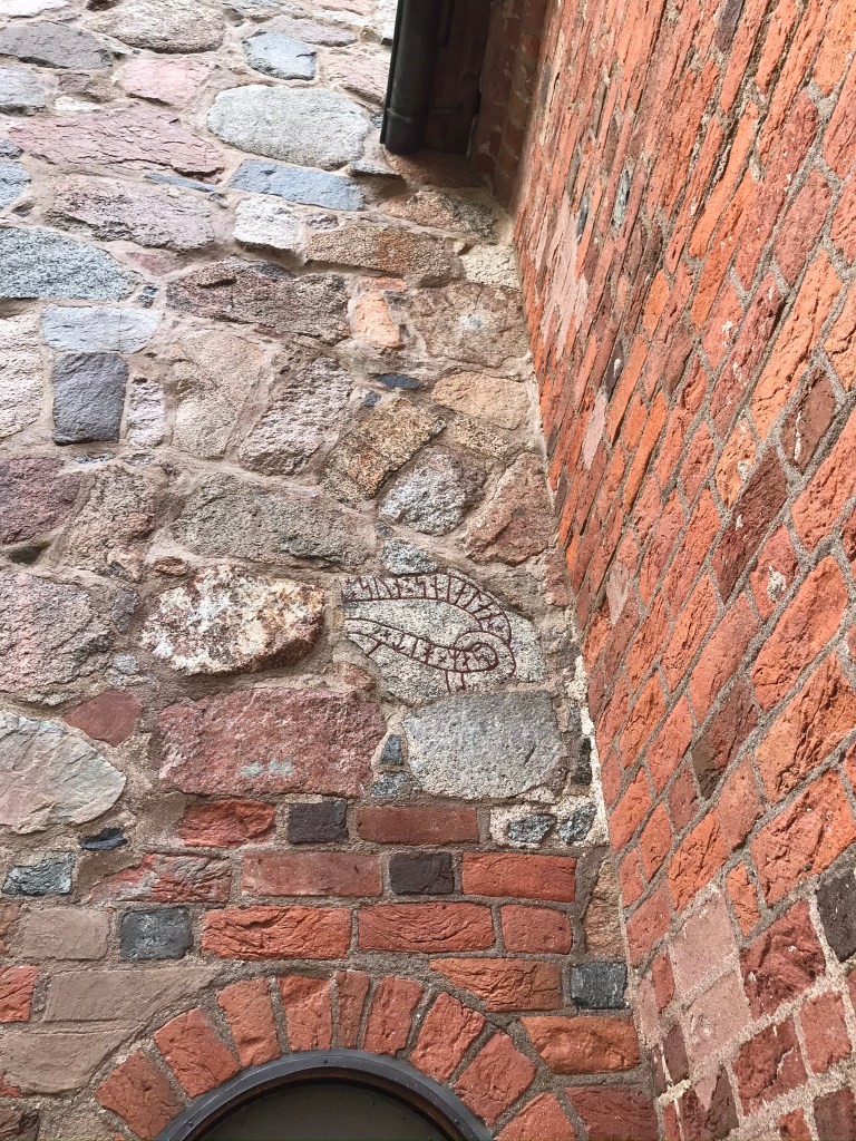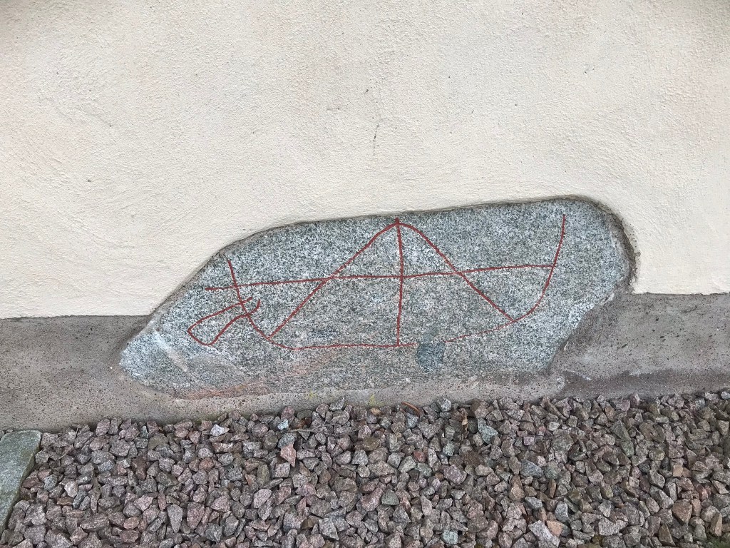 Denna runsten som Johannes Bureus ritade av 1594, doldes senare under rappningen och återupptäcktes först 1929. Den frilades helt 1950 genom riksantikvarieämbetets försorg. // This runestone, which Johannes Bureus drew off 1594, was later hidden during the plastering and was not rediscovered until 1929. It was completely cleared in 1950 by the National Heritage Board.