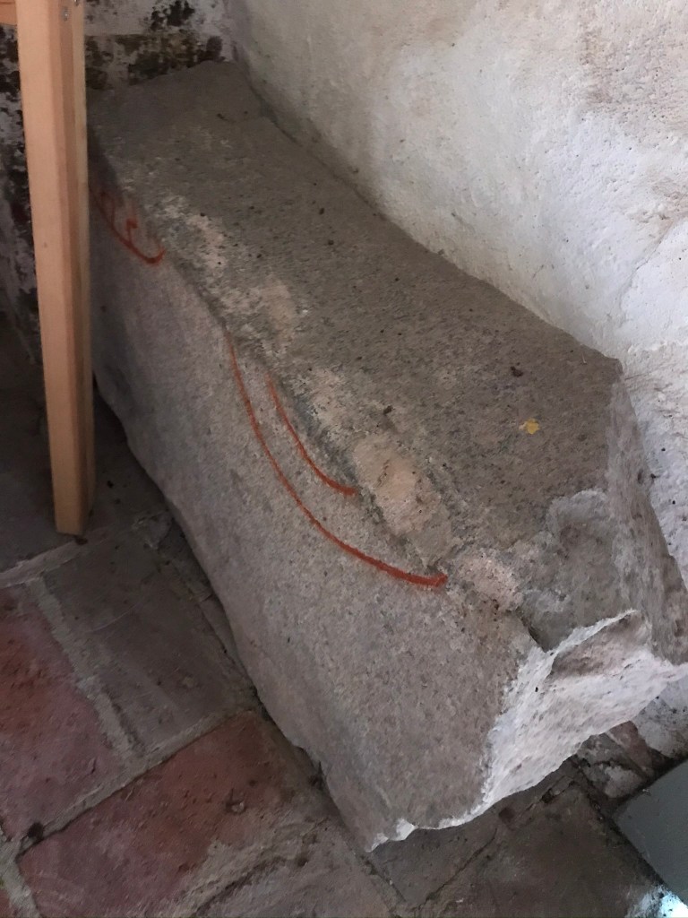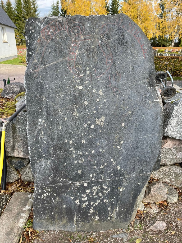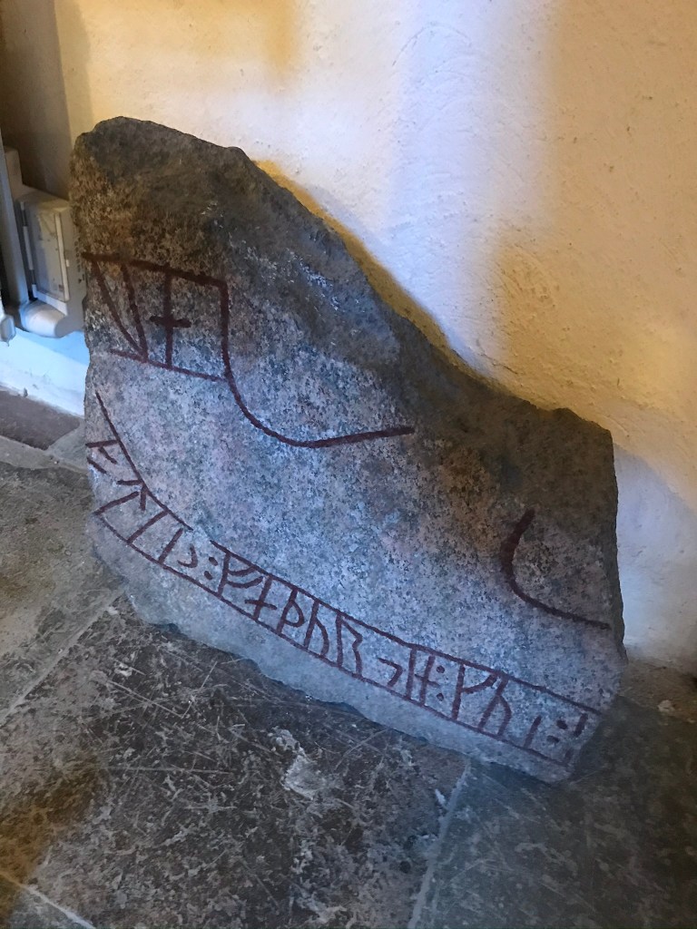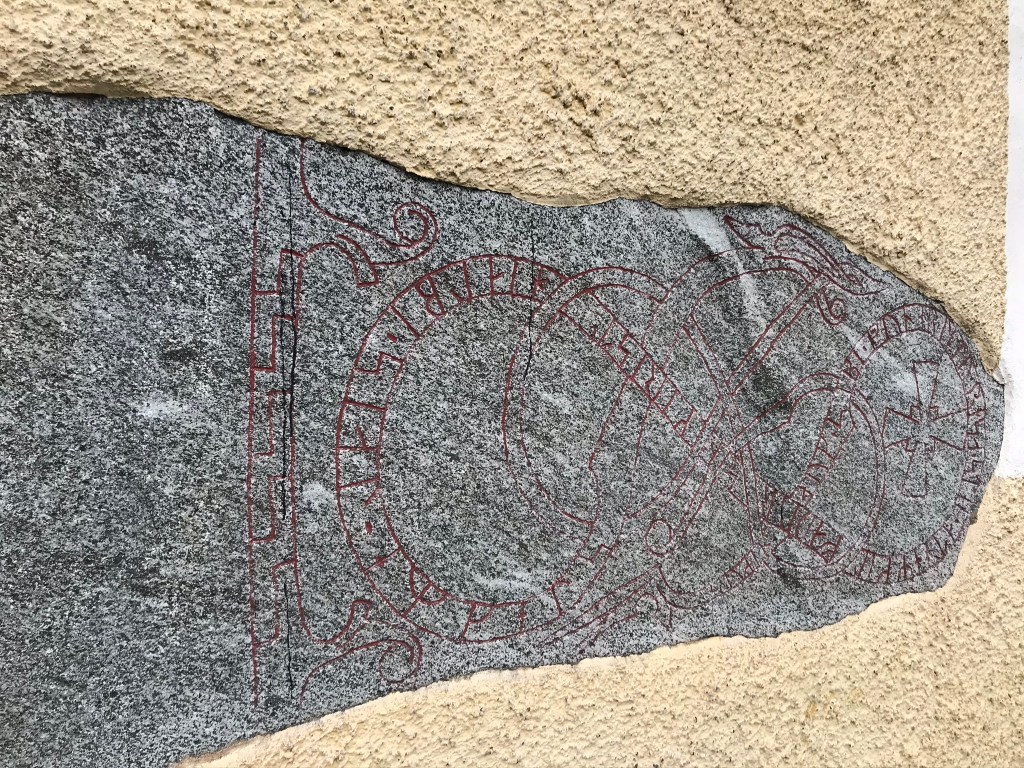 Runstenen har tidigare varit inmurad i dörren till vapenhuset. Den togs fram ur muren på 1800-talet men lagades först 1950. Stenen var sönderslagen 1594 då Johannes Bureus undersökte den. // The runestone has previously been walled in the door to the armory. It was extracted from the wall in the 19th century but was not repaired until 1950. The stone was smashed in 1594 when Johannes Bureus examined it.