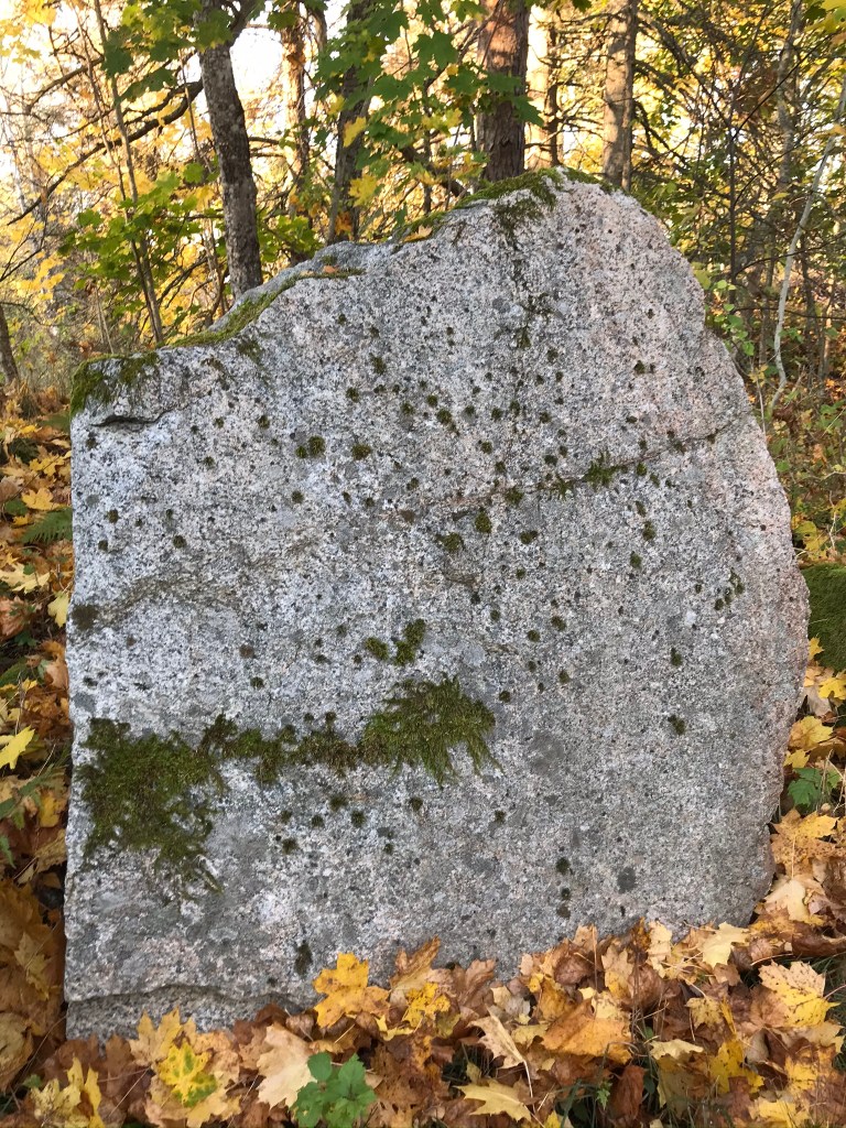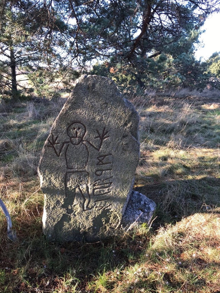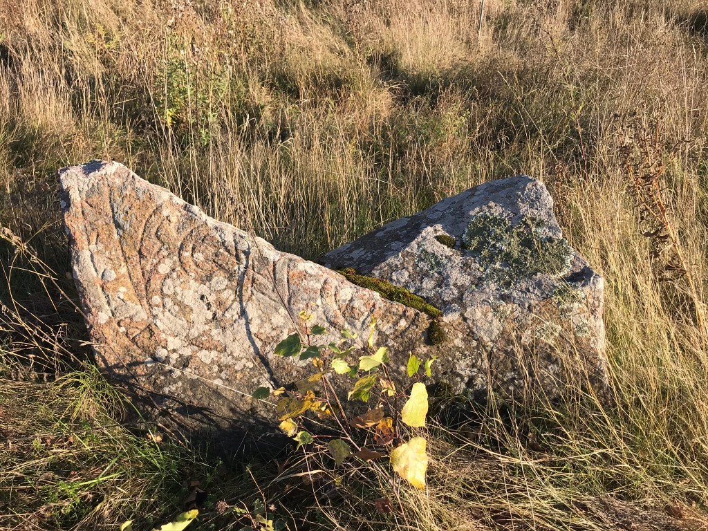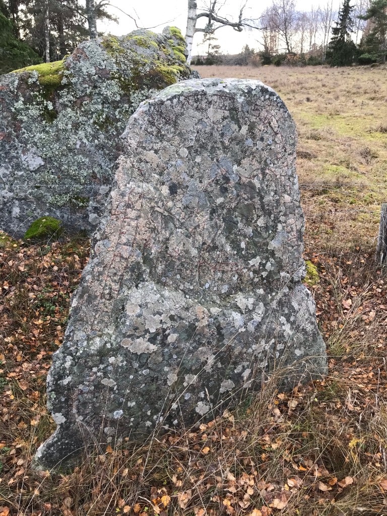 Första ordet är möjligen den dödes namn i lönnskrift. Andra ordet skulle kunna vara substantivet ”sten”. Runornas utformning och figurens primitiva och naiva typ (den skulle kunna föreställa en ‘oran’, en bedjande man) kan placera stenen vid mitten av 500-talet. // The first word is possibly the deceased’s name in the clandestine script. The second word could be the noun ”stone”. The design of the runes and the primitive and naive type of the figure (it could represent an ‘oran’, a praying man) can place the stone in the middle of the 6th century.