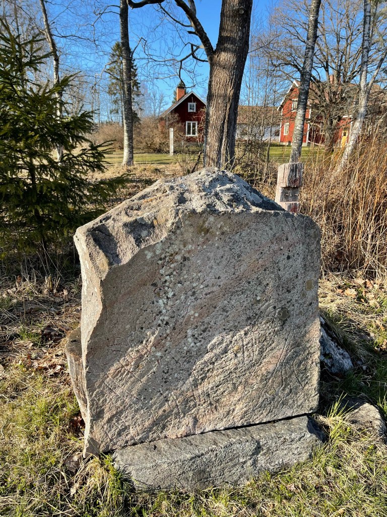 Äldsta uppgiften om runstenen är från 1638. Den har troligen tidigare stått vid den gamla landsvägen mot Hållnäs kyrka, i anslutning till en vikingatida bro över sankmark. Sin nuvarande plats fick stenen på 1930-talet. Enligt uppgifter från traktens bönder 1638 skulle runstenen ha rests av en ”knape” (= storbonde eller bygdehövding). Den strama texten passar väl till den enkla ormslingan, som ger ett ålderdomligt intryck. Detta förstärks dessutom av att stenen saknar kors eller kristna inslag. // The oldest information about the runestone is from 1638. It has probably previously stood by the old country road towards Hållnäs church, adjacent to a Viking-era bridge over the marshland. The stone got its current place in the 1930s. According to information from the area’s farmers in 1638, the runestone would have been erected by a ”knape” (= important farmer or village chief). The austere text fits well with the simple snake loop, which gives an ancient impression. This is also reinforced by the fact that the stone lacks crosses or Christian elements.