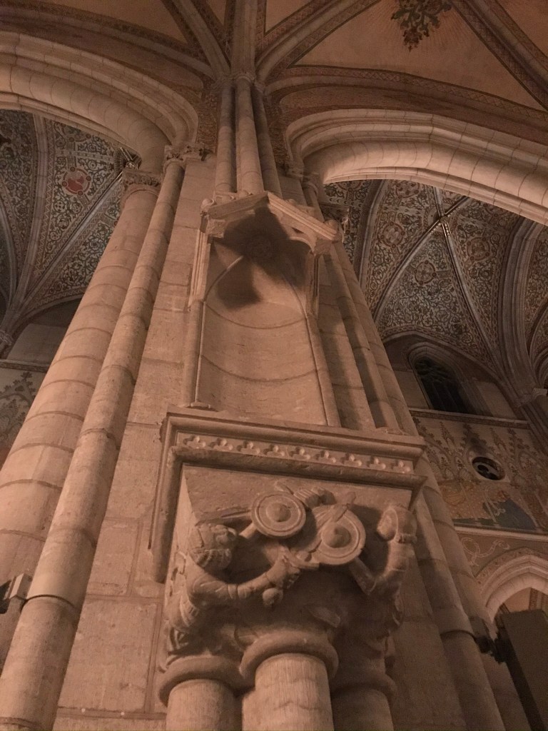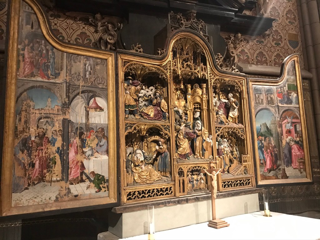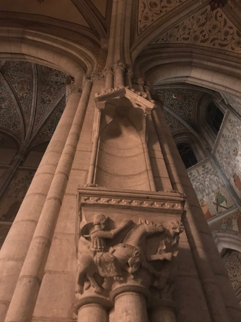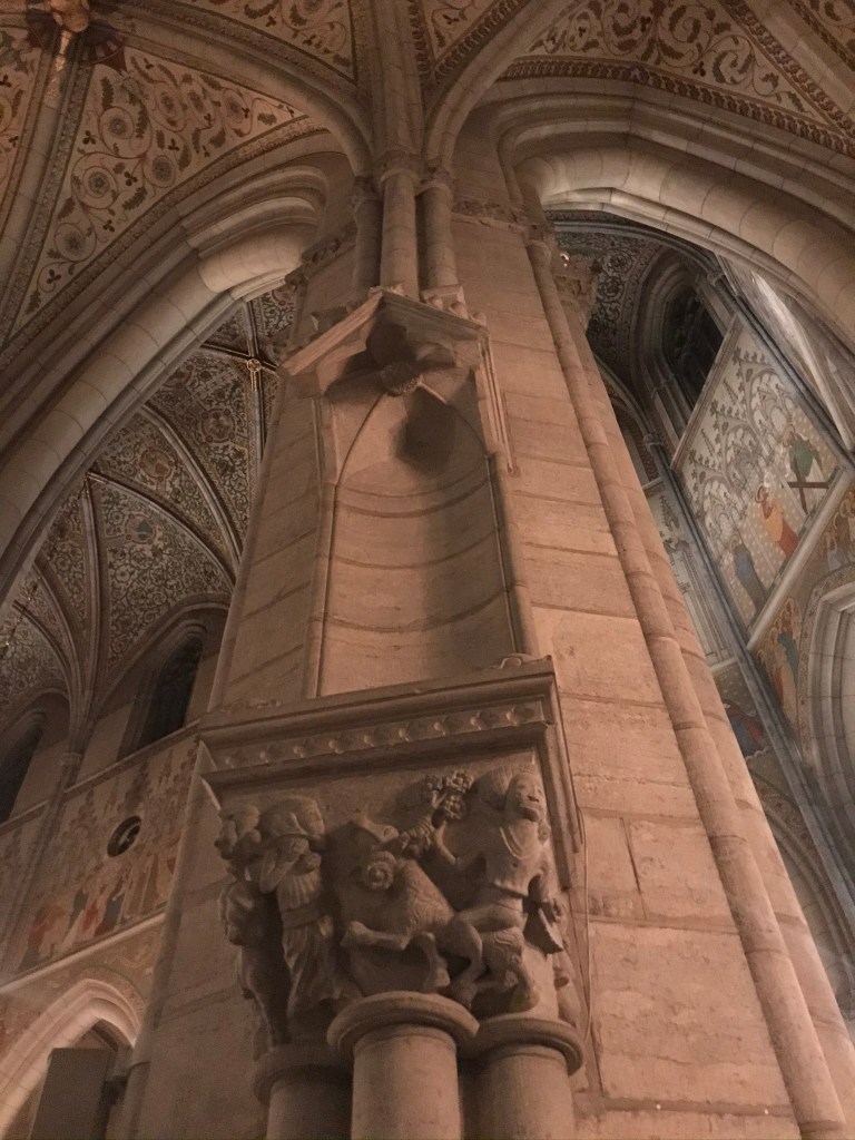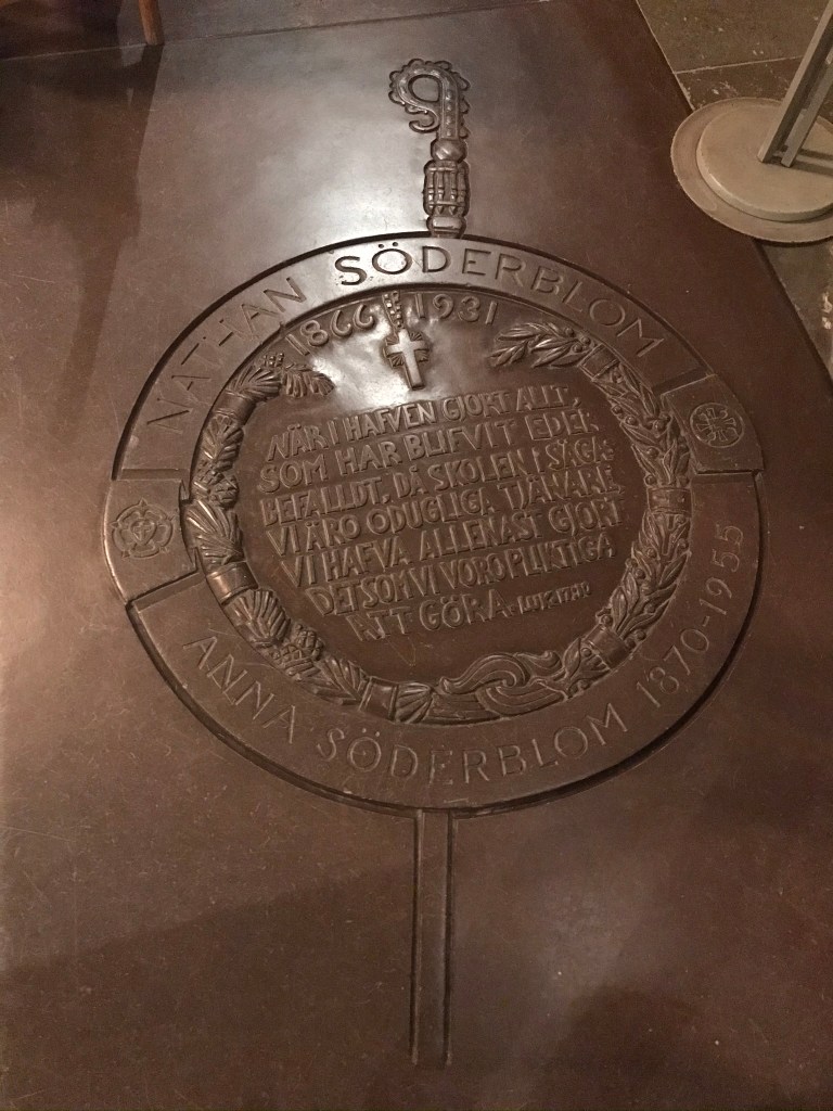 The Sanctuary preserves its medieval character, but the cross-monument is from 1976 and made by Bertil Berggren-Askenström (1917-2006) of silver and cristal glas. It is almost 3 m high. The baptismal font (dopfunten) is from 1757 and made by Magnus Granlund (d. 1779) of wood. The grave of Archbishop Laurentius Petri Nericius (1499-1573), the first Archbishop of the reformed Sweden.The grave of Archbishop Nathan Söderblom (1866-1931) and his wife Anna. Söderblöm got the Nobel prize for peace in 1930 for all the ecumenical work he had done before. The grave of Olof/Olaus Rudbeck (1630-1702), scientist and professor, writer of ”Atlantica”. On the grave, it is written: ”Of his immortality witnesses Atlantica / Of his mortality, this grave”. Corbel 1: dying in battle without taking the communion, a sudden, evil death.Corbel 2: Virgin Mary’s death, a good death.Corbel 3: ”Jews’ sow”/judesuggan, an anti-Jewish symbol or a symbol for the old religion Judaism. Corbel 4: a pagan sacrificial rite, the creature symbolizing unbelief.Corbel 5: the Christian faith is symbolized by the communion.Corbel 6: Un-Christian living, with symbols for pleasure, recklesness, fornication and unchastity. Corbel 7: saddler Staffan symbolizing the Christmas miracle or the Apostle Paul being converted.Corbel 8: the death of martyr Stefan, the stones symbolizing holding to one’s faith.Corbel 9: the female pelican feeding its chicks is a symbol for Christ’s salvation and resurrection.Corbel 10: the relics of Saint Erik are moved to Uppsala. Corbel 11: Jacob is wrestling with God and Joshua as Moses’ successorCorbel 12: the eagle’s defeat of the dragon symbolizes Christ’s victory over evil.