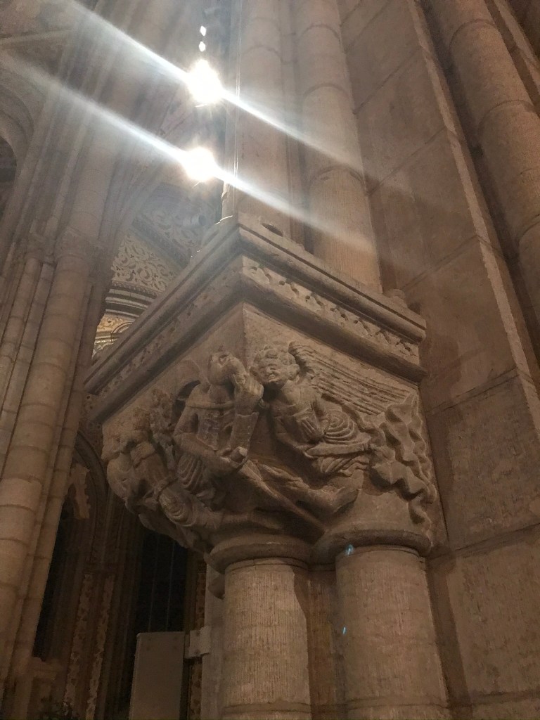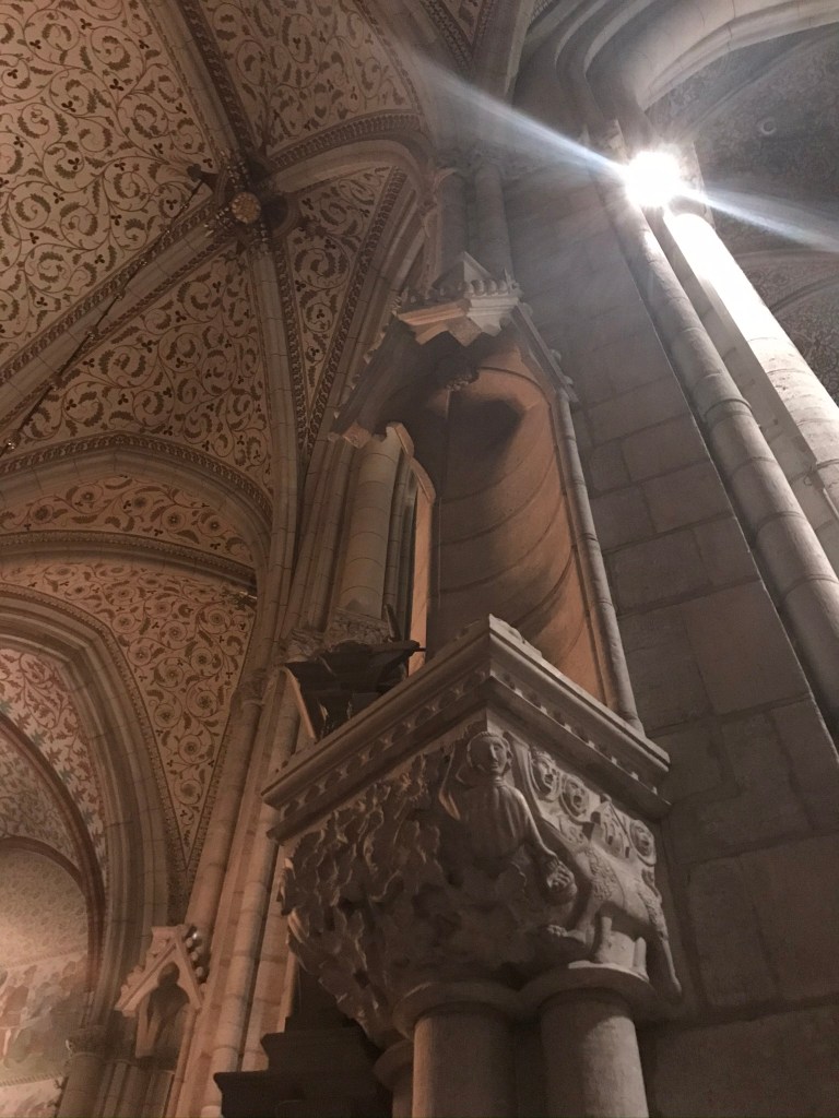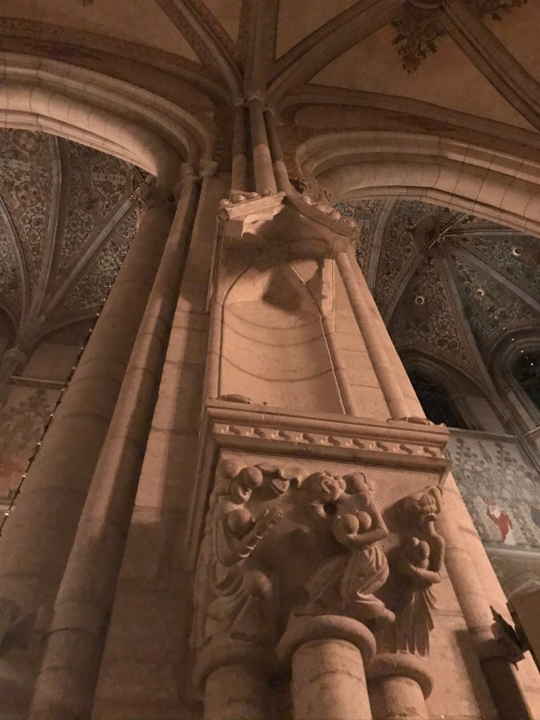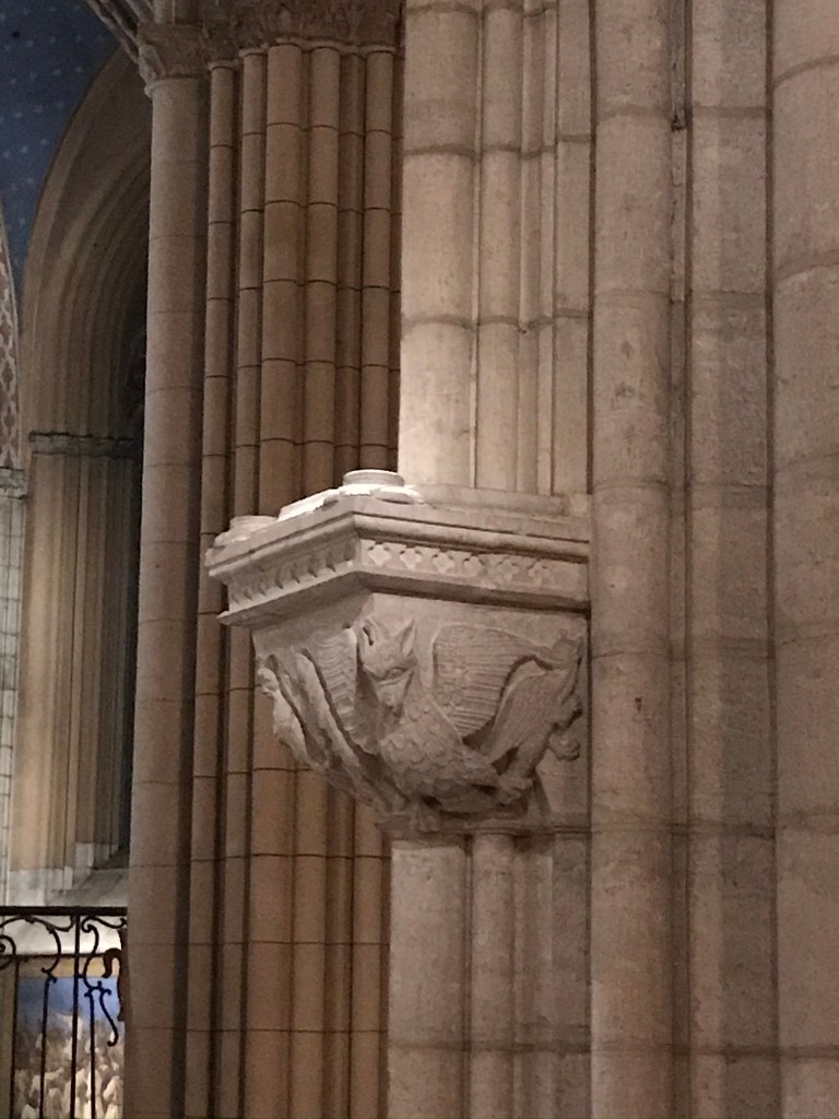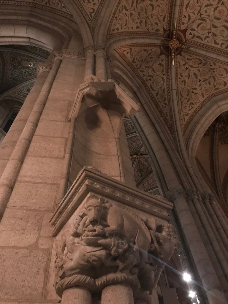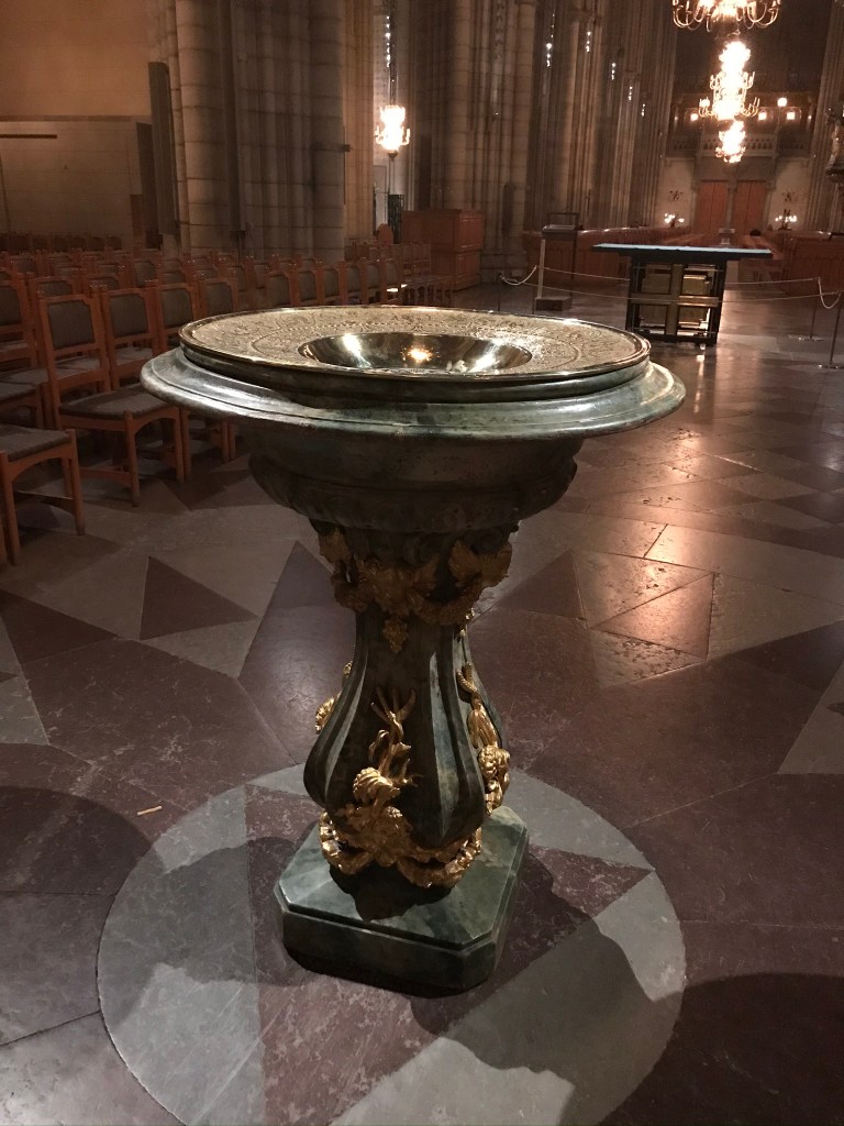 The Sanctuary preserves its medieval character, but the cross-monument is from 1976 and made by Bertil Berggren-Askenström (1917-2006) of silver and cristal glas. It is almost 3 m high. The baptismal font (dopfunten) is from 1757 and made by Magnus Granlund (d. 1779) of wood. The grave of Archbishop Laurentius Petri Nericius (1499-1573), the first Archbishop of the reformed Sweden.The grave of Archbishop Nathan Söderblom (1866-1931) and his wife Anna. Söderblöm got the Nobel prize for peace in 1930 for all the ecumenical work he had done before. The grave of Olof/Olaus Rudbeck (1630-1702), scientist and professor, writer of ”Atlantica”. On the grave, it is written: ”Of his immortality witnesses Atlantica / Of his mortality, this grave”. Corbel 1: dying in battle without taking the communion, a sudden, evil death.Corbel 2: Virgin Mary’s death, a good death.Corbel 3: ”Jews’ sow”/judesuggan, an anti-Jewish symbol or a symbol for the old religion Judaism. Corbel 4: a pagan sacrificial rite, the creature symbolizing unbelief.Corbel 5: the Christian faith is symbolized by the communion.Corbel 6: Un-Christian living, with symbols for pleasure, recklesness, fornication and unchastity. Corbel 7: saddler Staffan symbolizing the Christmas miracle or the Apostle Paul being converted.Corbel 8: the death of martyr Stefan, the stones symbolizing holding to one’s faith.Corbel 9: the female pelican feeding its chicks is a symbol for Christ’s salvation and resurrection.Corbel 10: the relics of Saint Erik are moved to Uppsala. Corbel 11: Jacob is wrestling with God and Joshua as Moses’ successorCorbel 12: the eagle’s defeat of the dragon symbolizes Christ’s victory over evil.