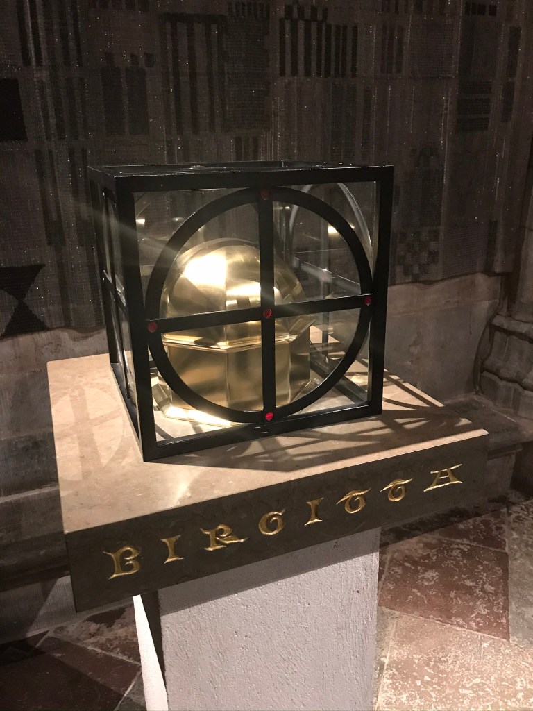 The shrine of King Erik Jedvardsson the Holy (d. 1160). The king’s remains were moved to Uppsala from Old Uppsala in 1273. The coffer is from 1579 and made by Hans Rosenfeldt and Gillis Coyet of 34,16 kg silver, 0,64 kg gold and 1,6 kg copper. The crown is from 1584, from the funerals of Queen Katarina Jagellonica. King Erik’s crown is also placed in the coffer. The grave of Birger Persson of Finsta (d. 1327) and his wife Ingeborg Bengtsdotter of the dynasty Folkunga (d. 1314), the parents of Saint Birgitta (1303-1373). The oldest picture of Saint Birgitta is that of a young girl on her parent’s gravestone. A relic from St Birgitta, donated by the sisters in Rome in 1986. The coffer is made by Olof Sundqvist (b. 1962) and the glass cover by Bengt Olof Kälde (1936-2014).The grave of Duchess Elisabet of Mecklenburg Vasa (1549-1597), dotter of Gustav Vasa and Margareta Leijonhufvud.