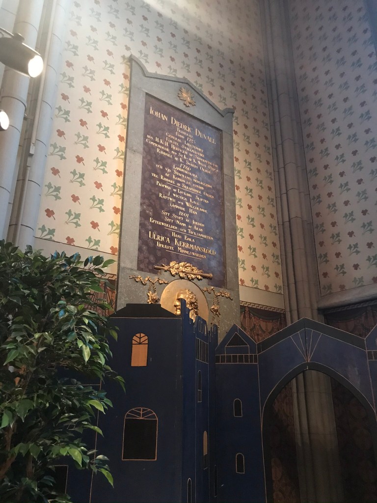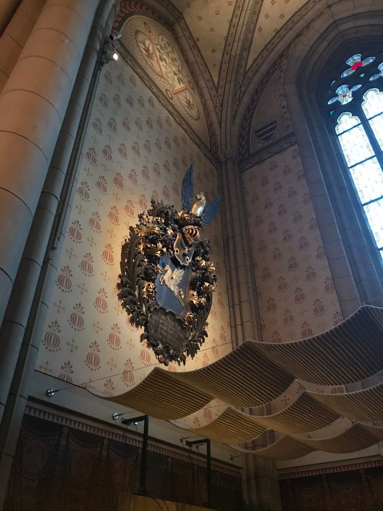 The silver crown and candles donated by Ras Taffari, the later Ethiopian Emperor Haile Selassie I (1892-1975). In the background, the monument over Count Christopher von Dohna (1628-1668) and his wife Anna Oxenstierna.The textile on the wall made by Ann-Mari Forsberg (1916-1992) and shows the most important historical events from the history of the Cathedral