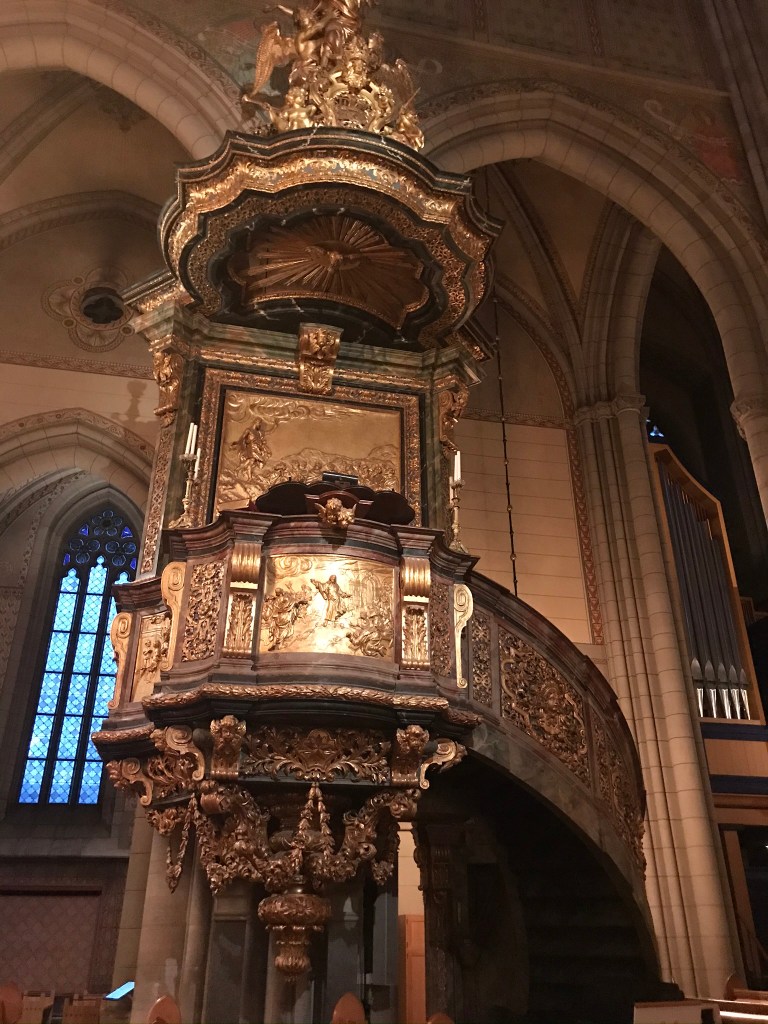 The pulpit was a gift from Queen Mother Hedvig Eleonora 1710, made by Burchardt Precht (1651-1738) and designed by Nikodemus Tessin the younger (1654-1728). It is made in Baroque-style, of small-leaved lime (lind) and of pinewood (furu), with gold inlays.